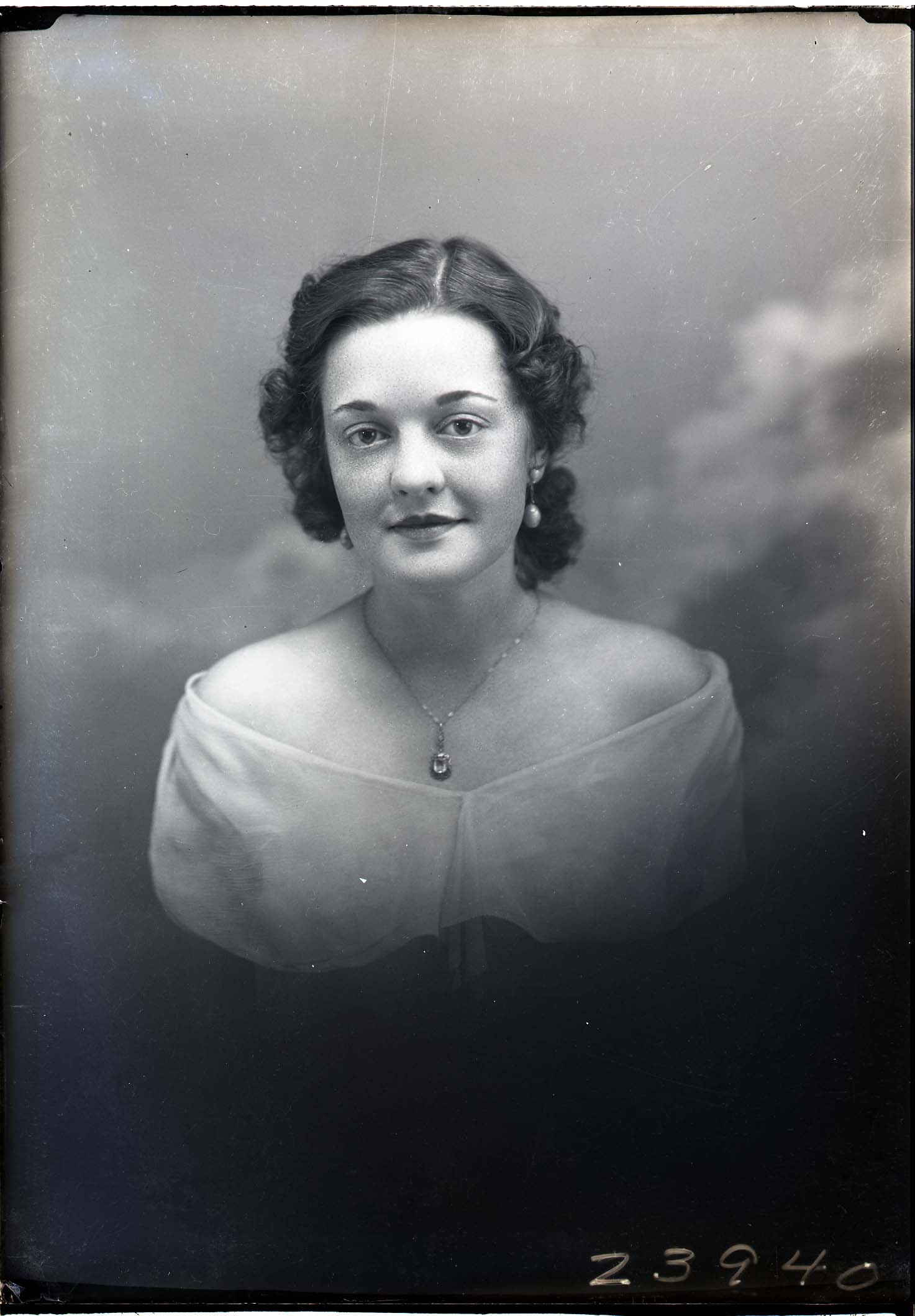 Portrait photograph of an unidentified young woman wearing earrings and a necklace with her dress.
