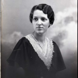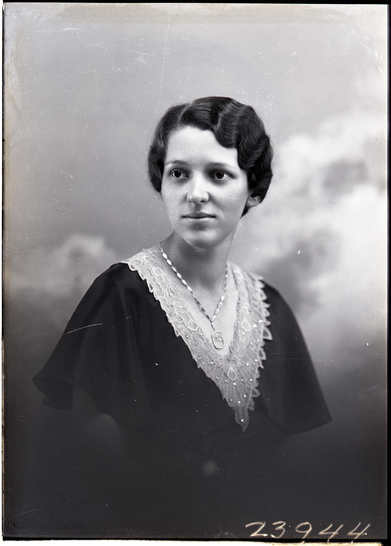 Portrait photograph of an unidentified young woman with her wavy hair pulled back and wearing a necklace with her dress.