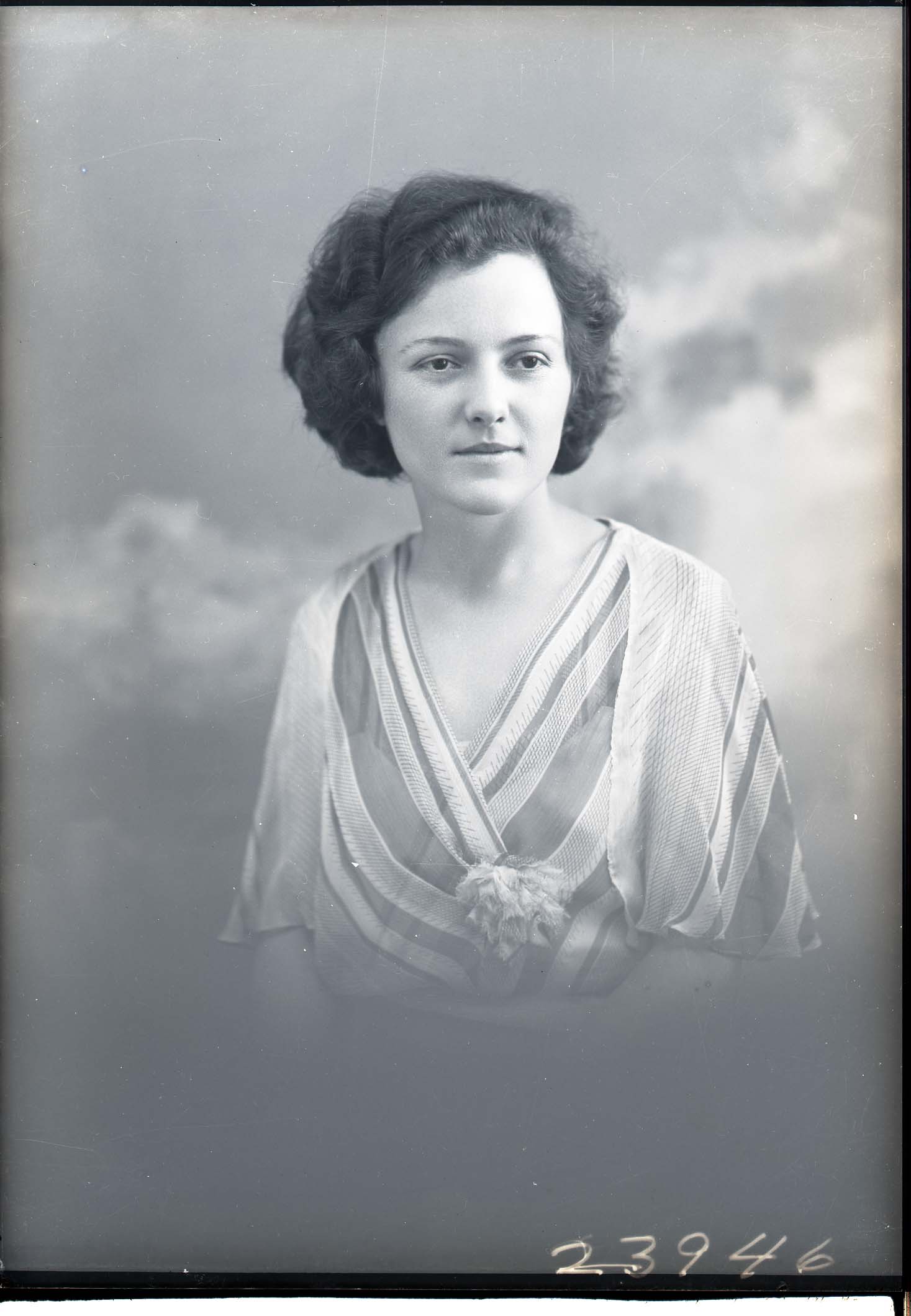 Portrait photograph of an unidentified young woman with short hair and wearing a striped dress with a flower corsage on the front.
