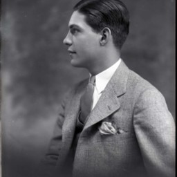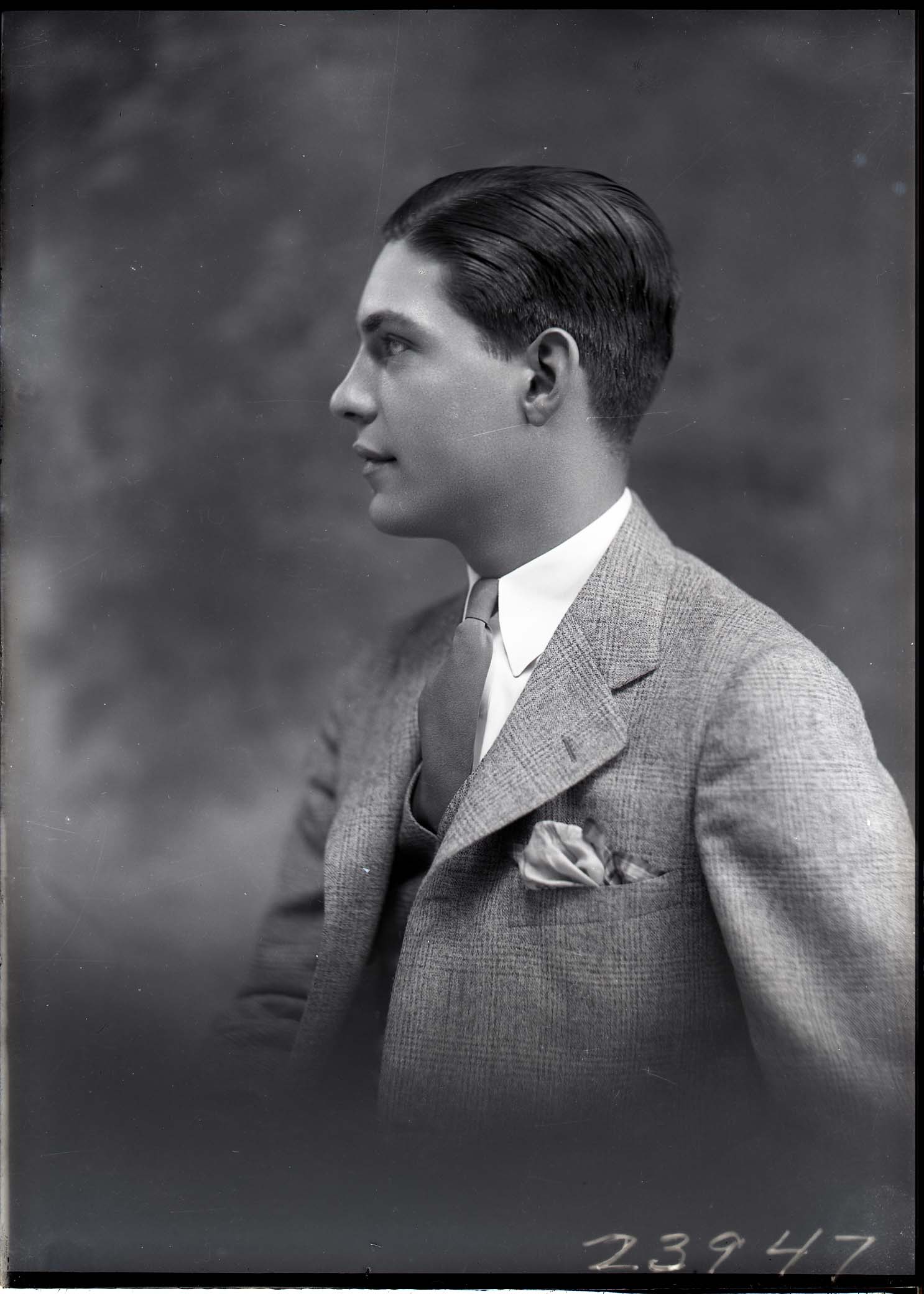 Portrait photograph of an unidentified young man posed in profile and wearing a suit and tie with a handkerchief in the breast pocket.