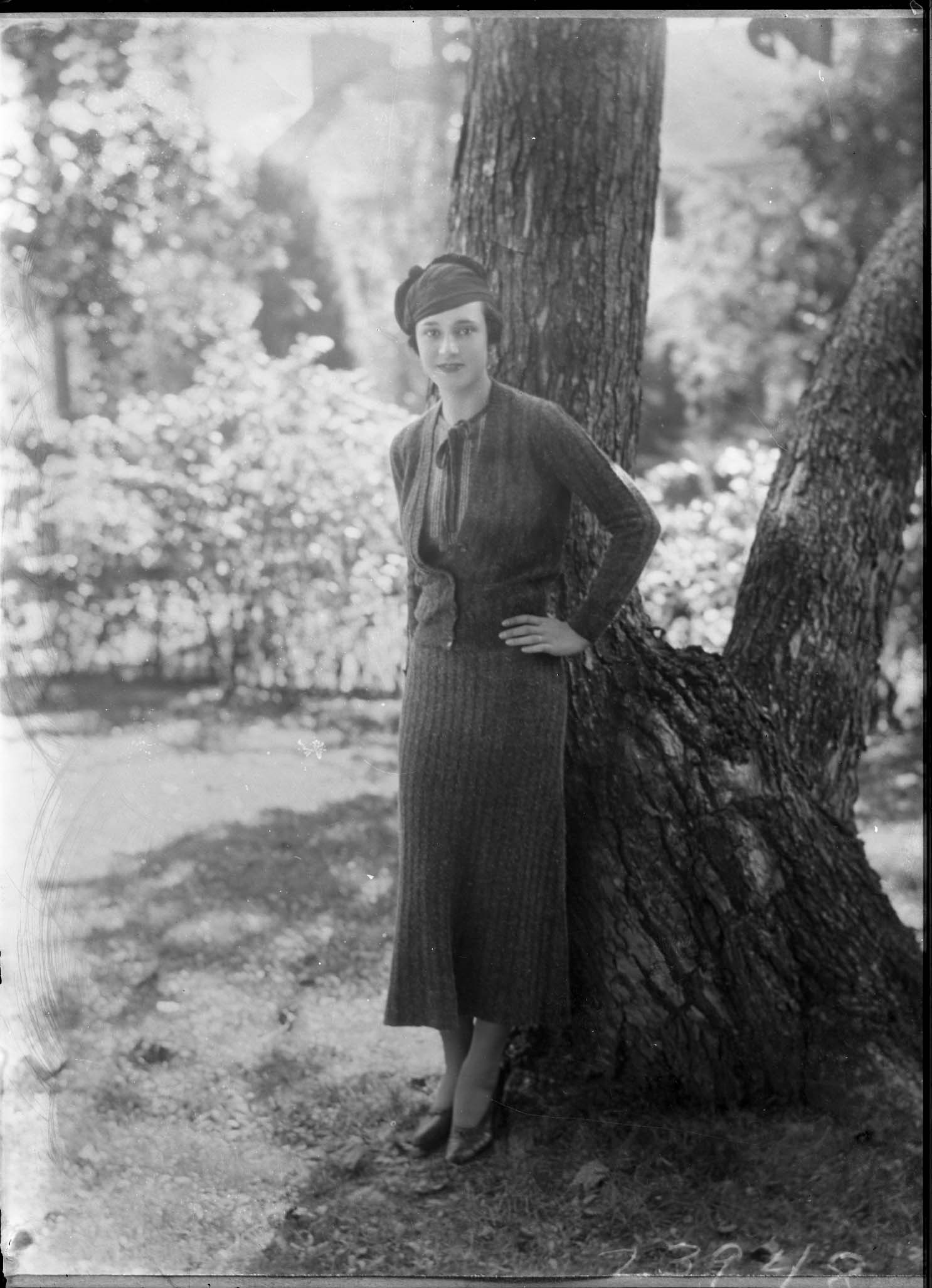 Unidentified woman wearing a hat, skirt, and sweater is standing by a tree outdoors with one hand on her hip.