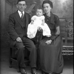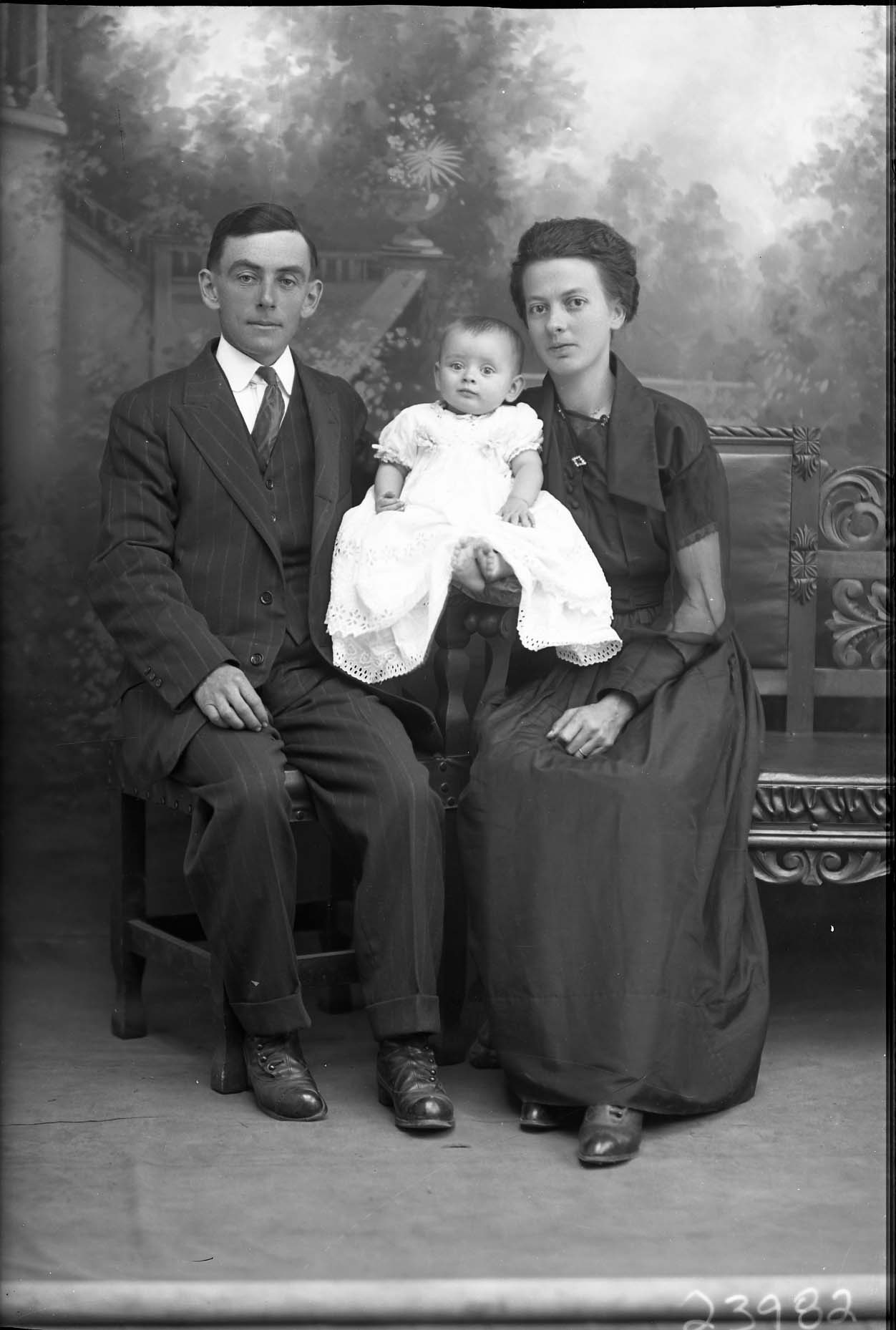 Unidentified man and woman are seated together with an unidentified small barefoot child posed between them.