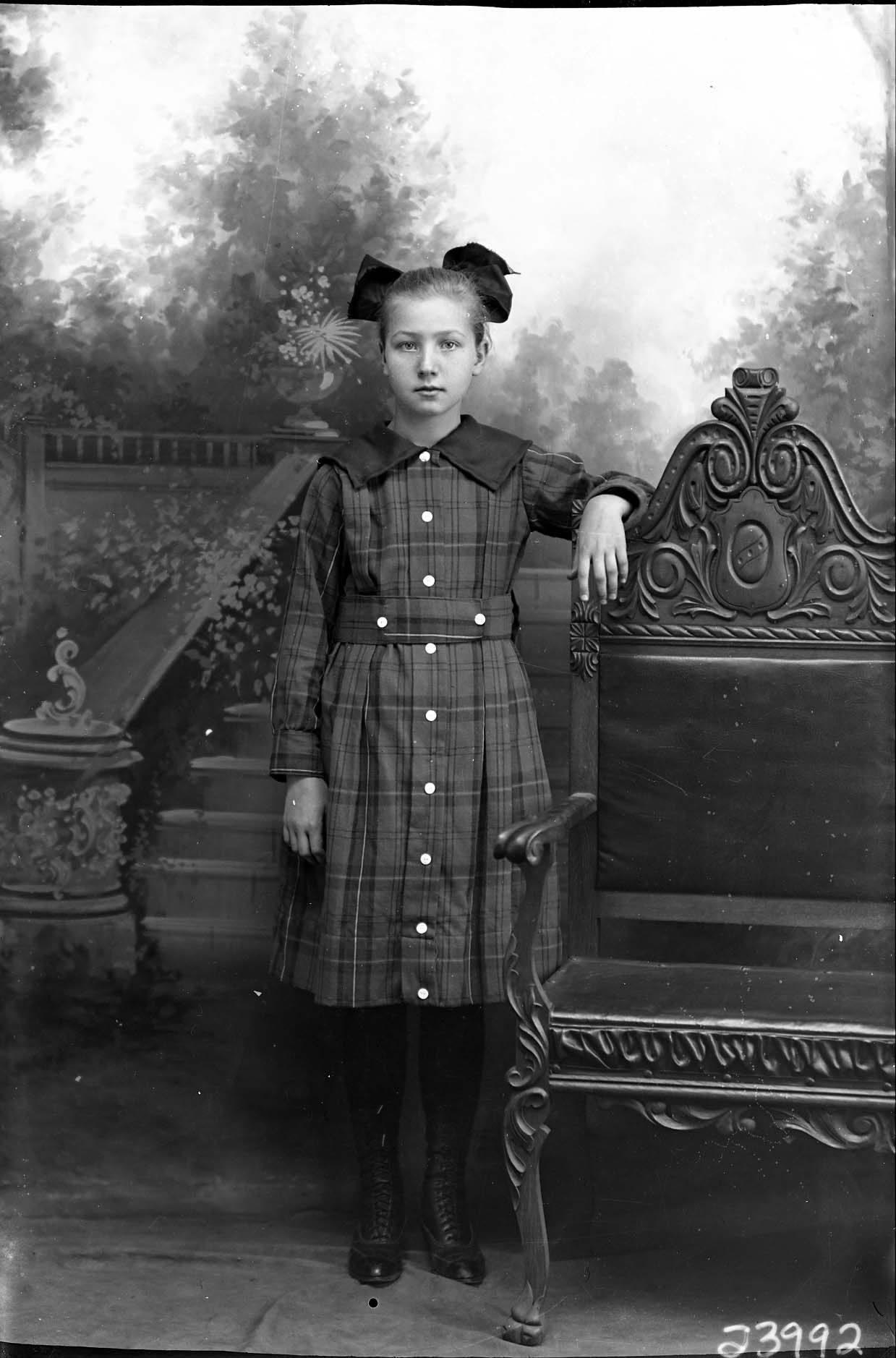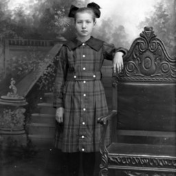 Unidentified girl with a bow in her hair and wearing a plaid dress is standing by a bench with an arm resting on its back.