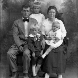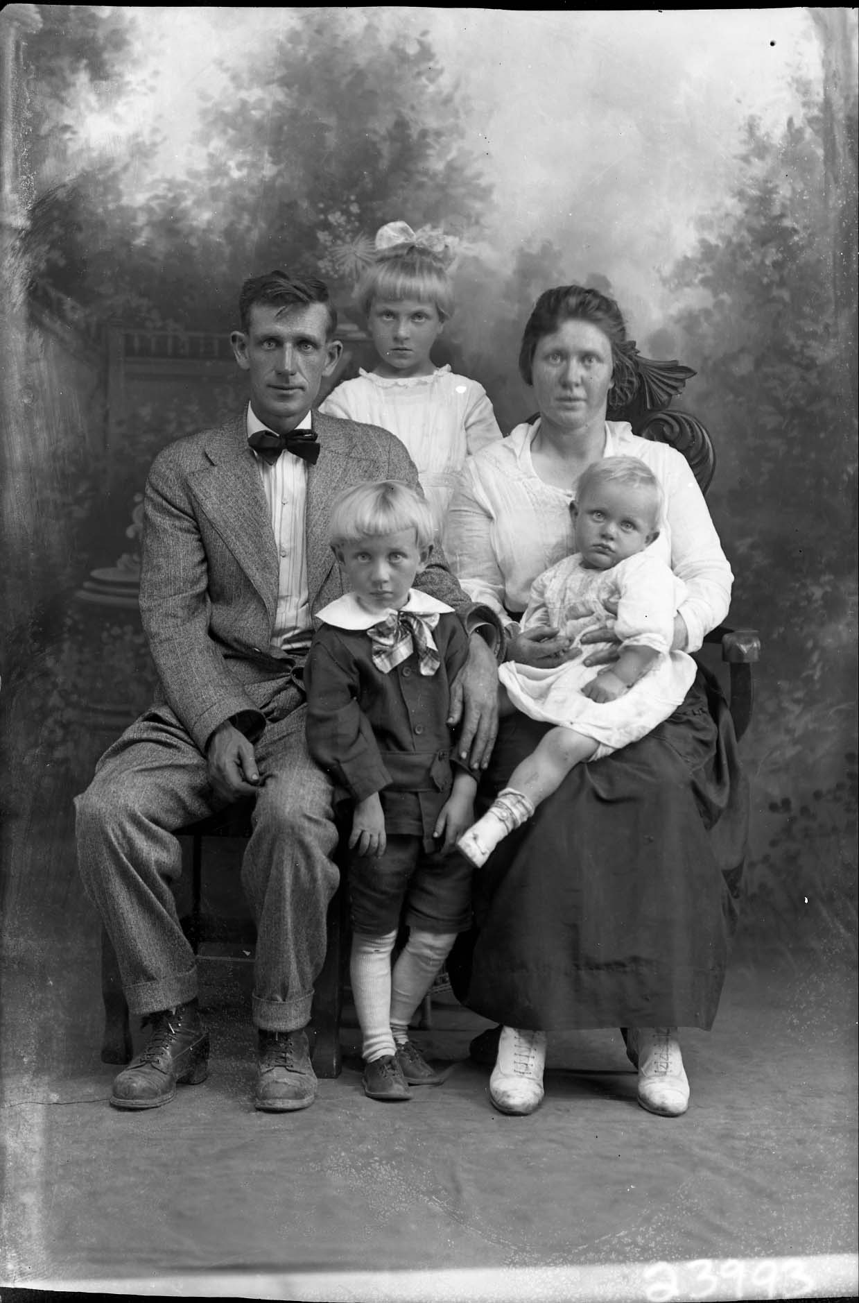 Unidentified man in a bow tie is seated beside an unidentified woman. Three unidentified blond children of different ages are posed with them.