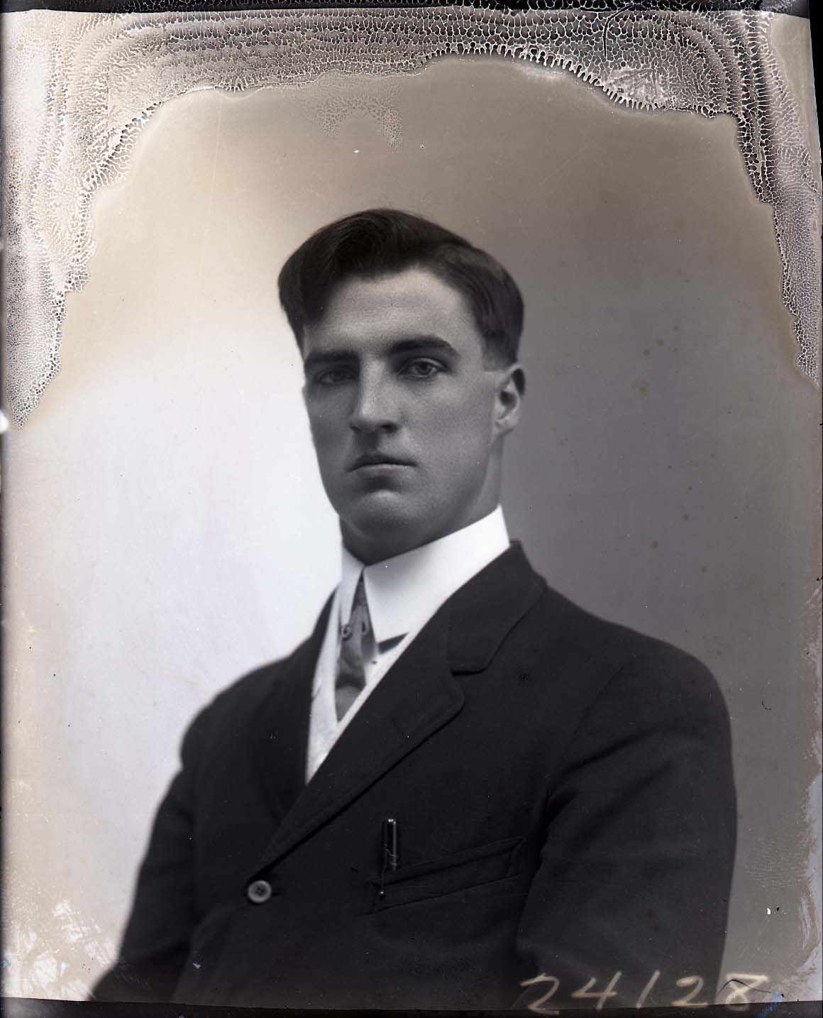 Portrait photograph of an unidentified man wearing a suit and tie with a starched collar. A pen is visible in his breast pocket.