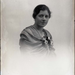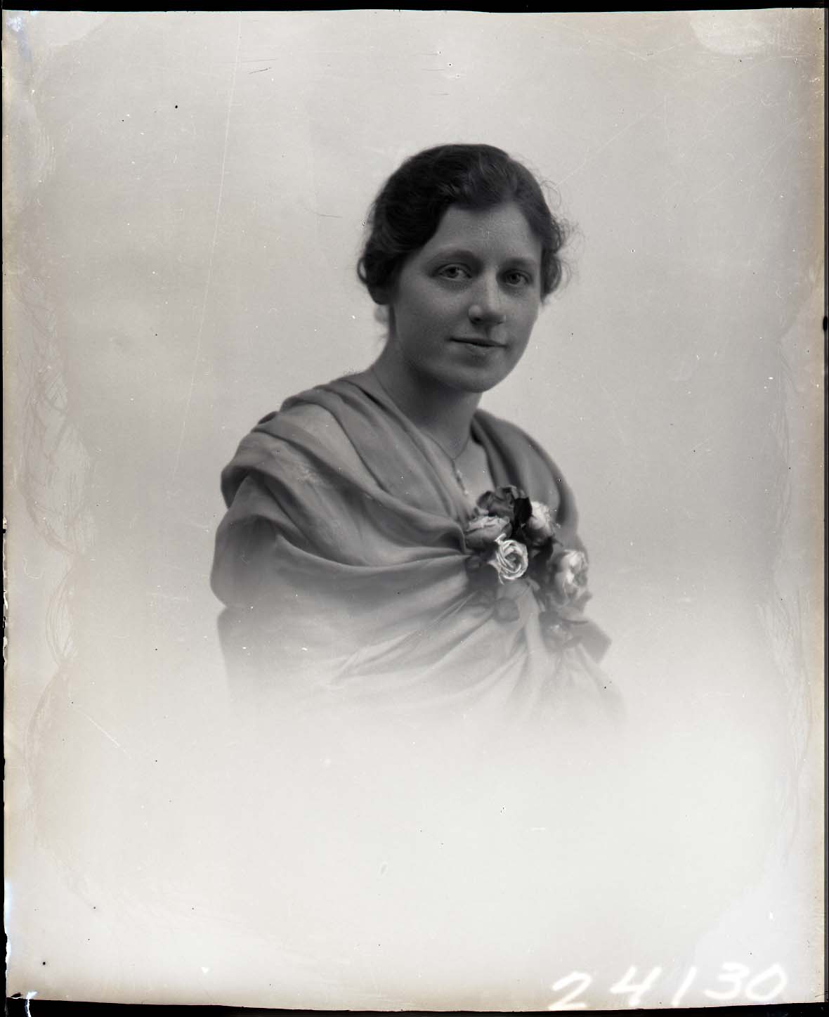 Portrait photograph of an unidentified woman wearing a floral corsage on the front of her dress.