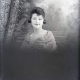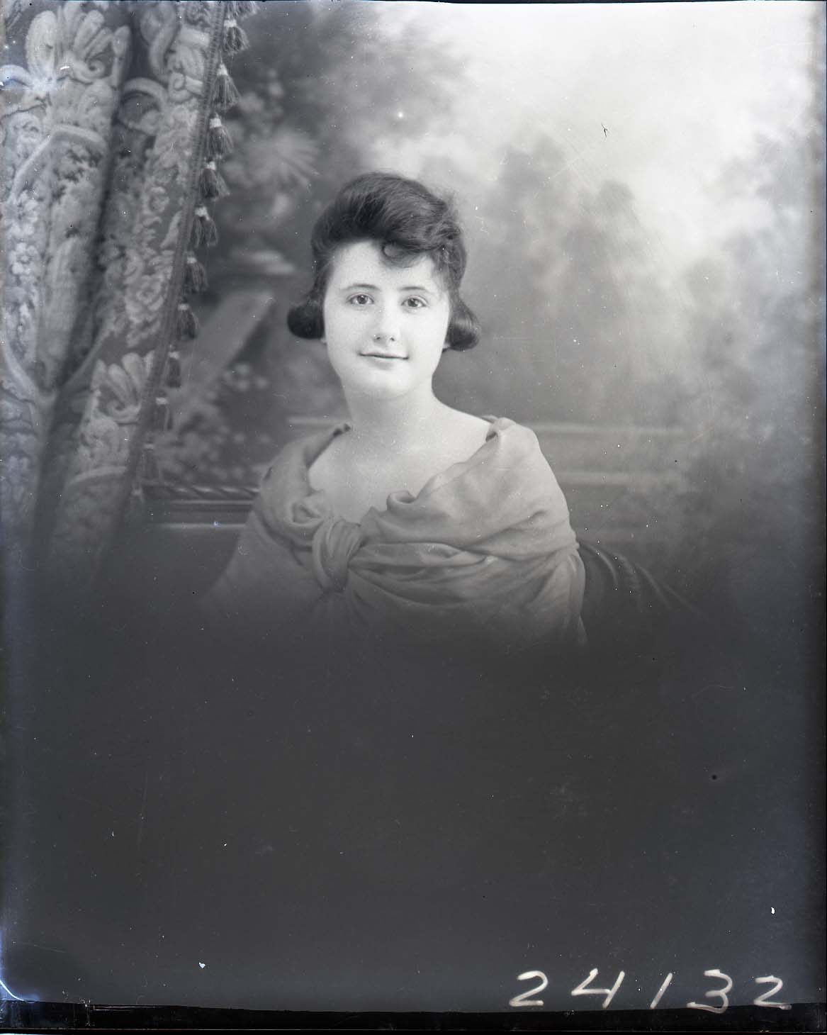Portrait photograph of an unidentified woman with styled hair and wearing what appears to be a photographer's drape.