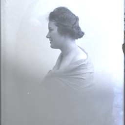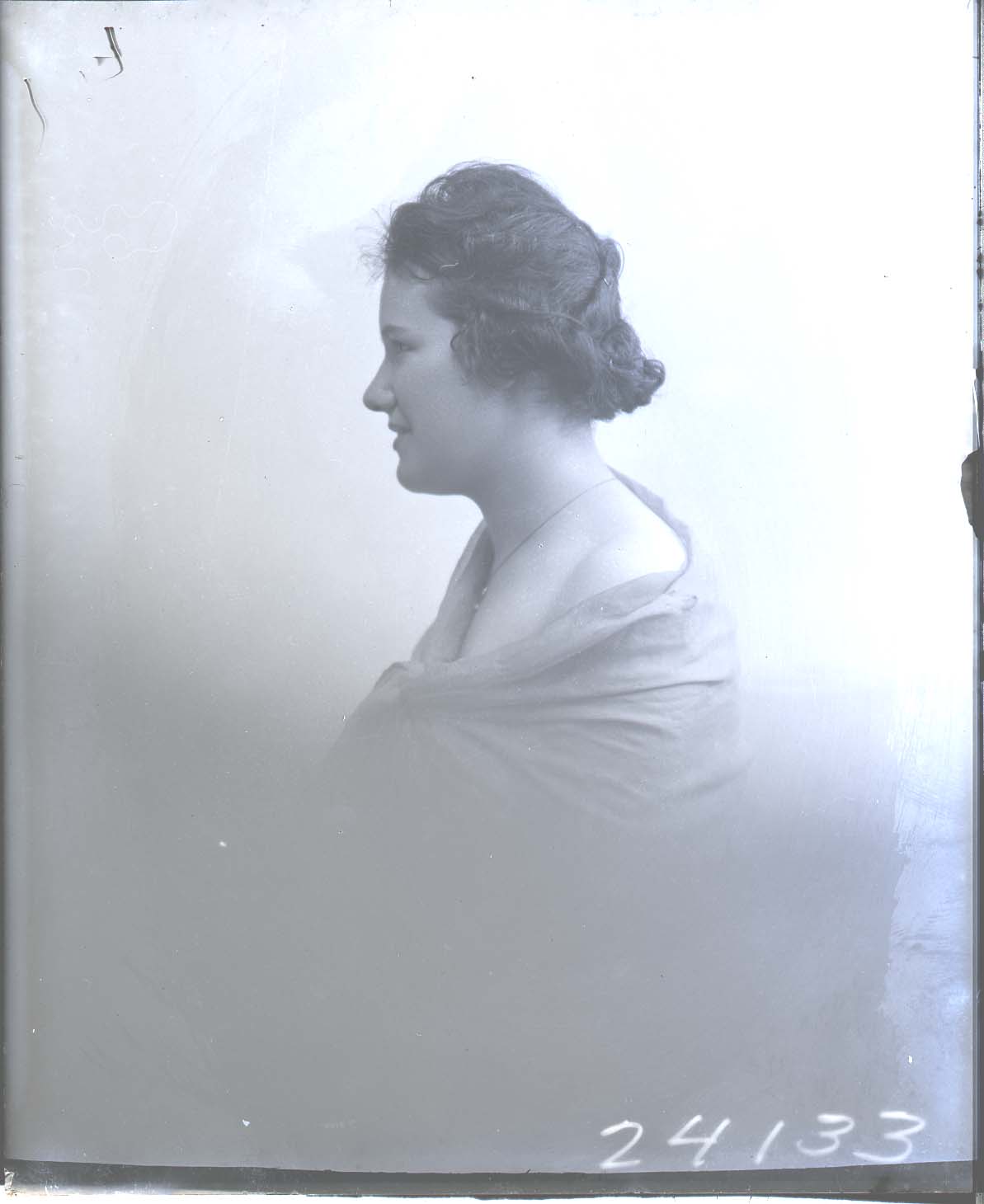 Portrait photograph of an unidentified woman in a photographer's drape posed looking to the side, in profile.