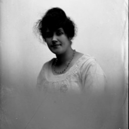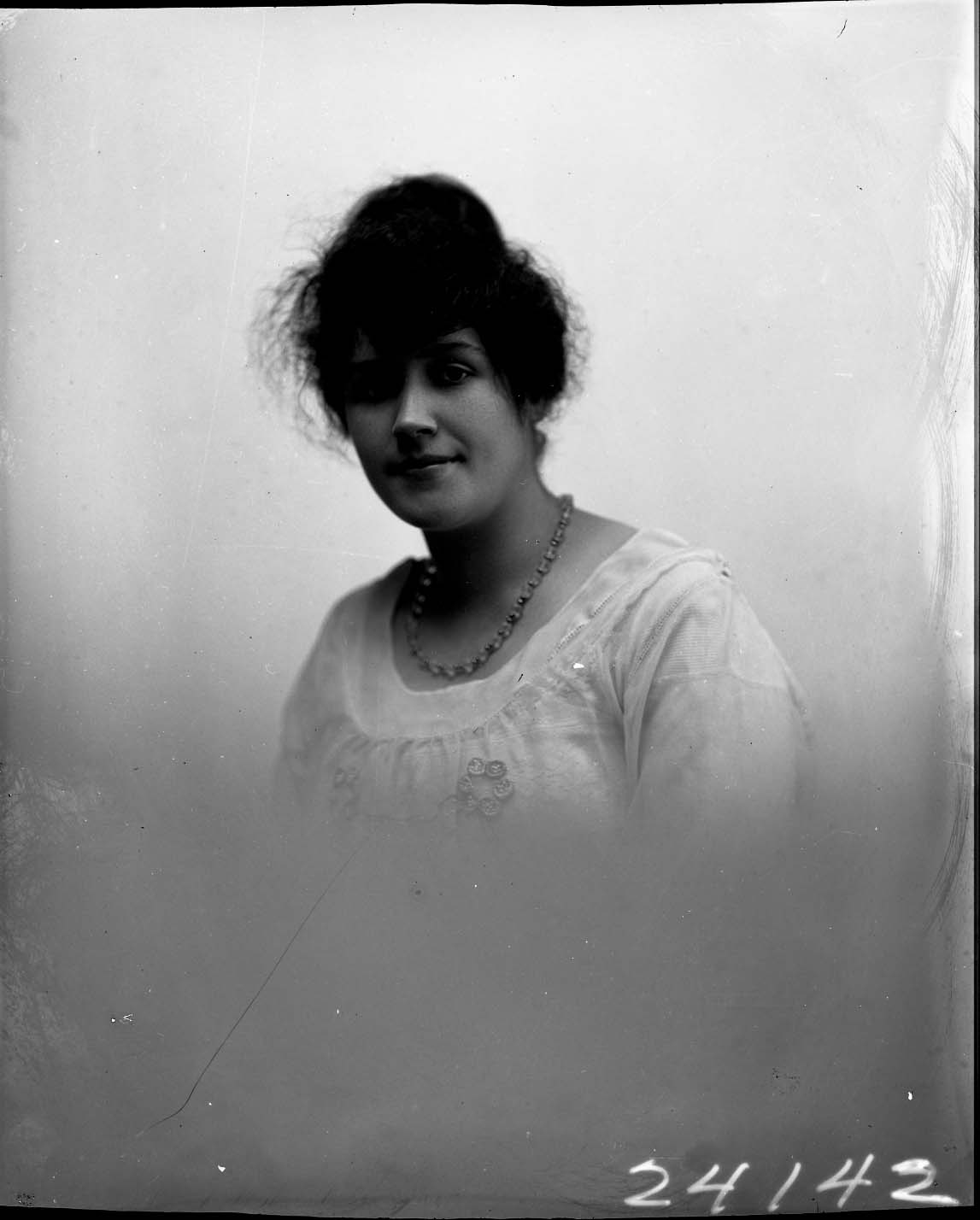 Portrait photograph of an unidentified woman with her hair styled up and wearing a necklace with her dress.