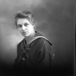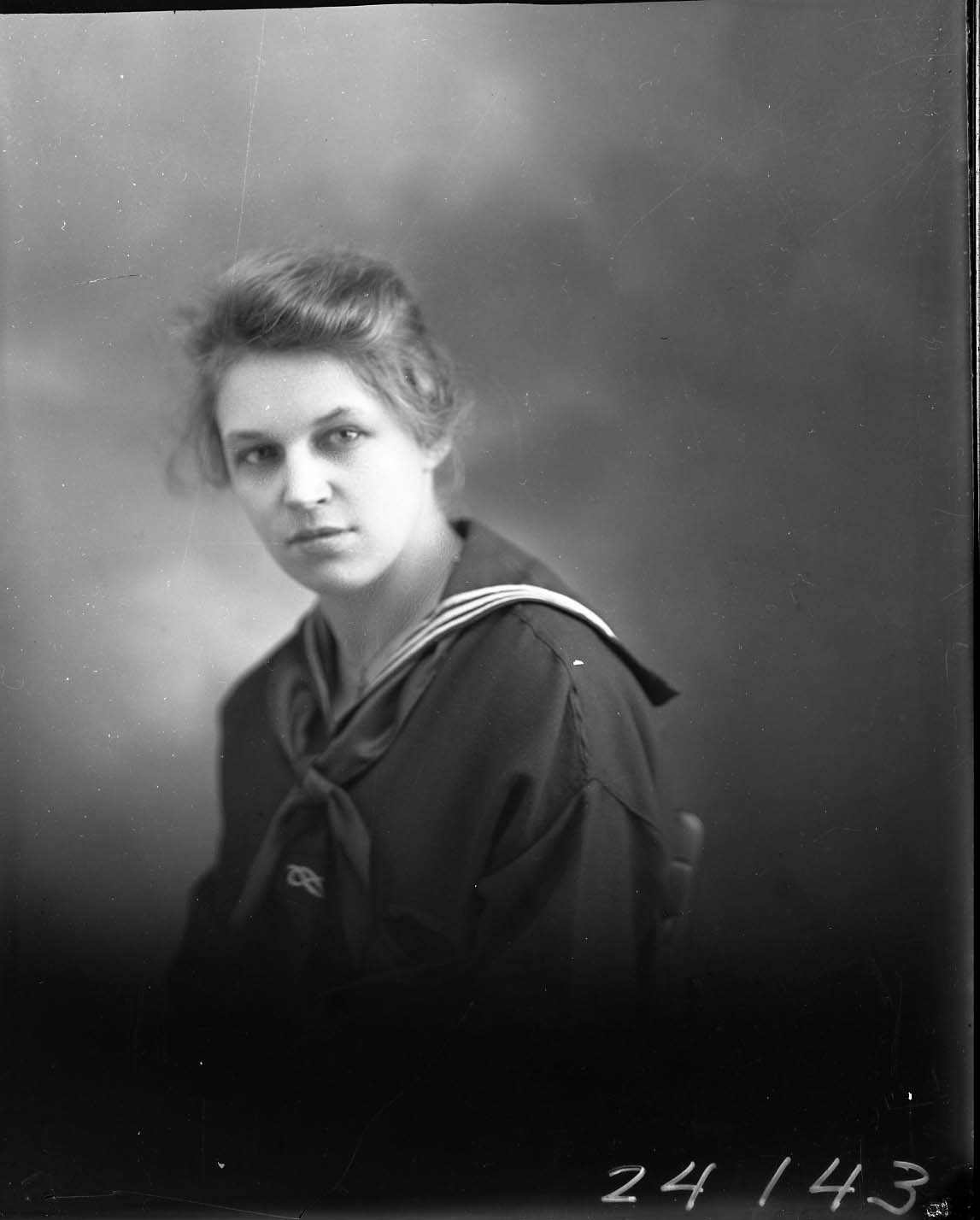 Portrait photograph of an unidentified woman with her hair pulled back and wearing a naval-themed outfit.