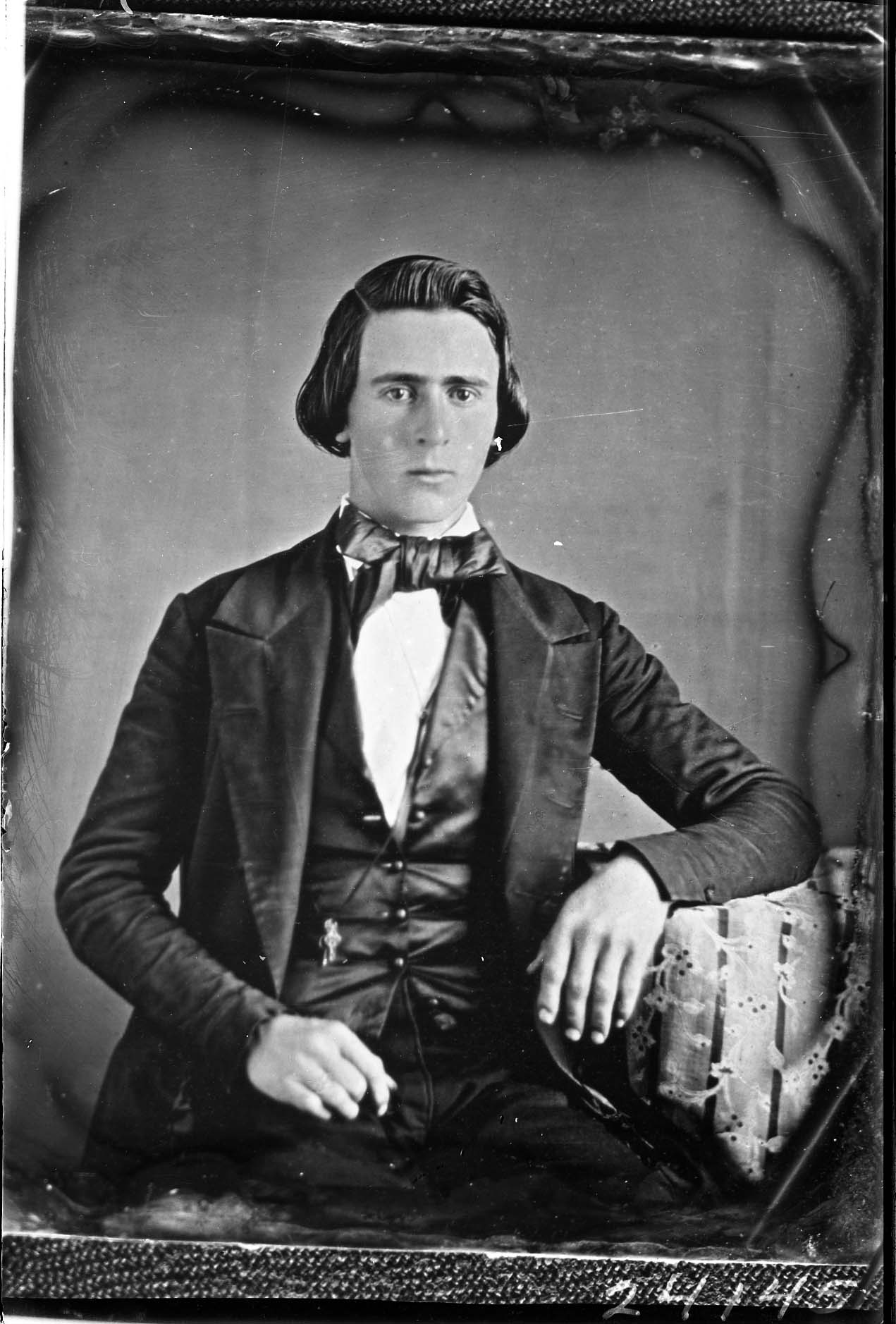 Photo of an older framed photograph of an unidentified young man, seated, and wearing clothes reminiscent of the late 19th century.