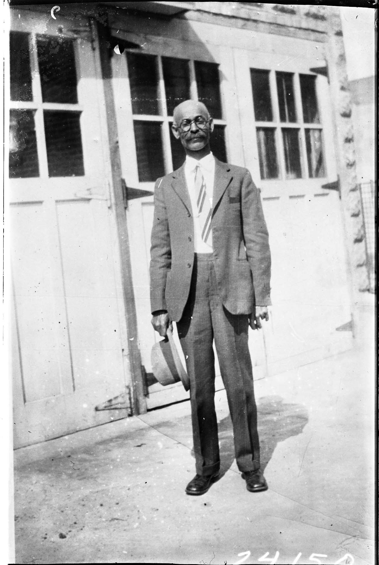 Unidentified older man with glasses and a mustache is standing outdoors and holding a hat in his hand.