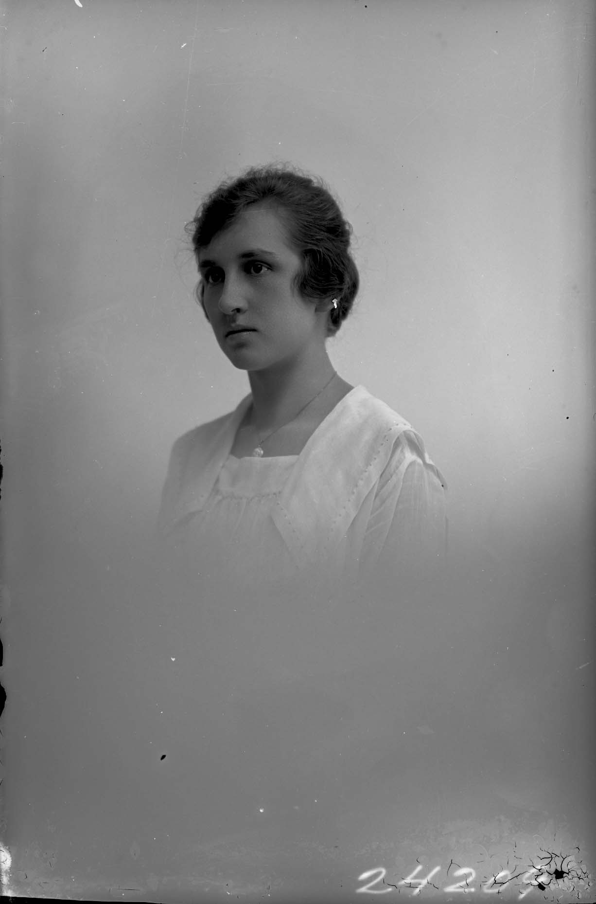 Portrait photograph of an unidentified young woman with her hair pulled back and wearing a necklace.