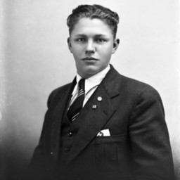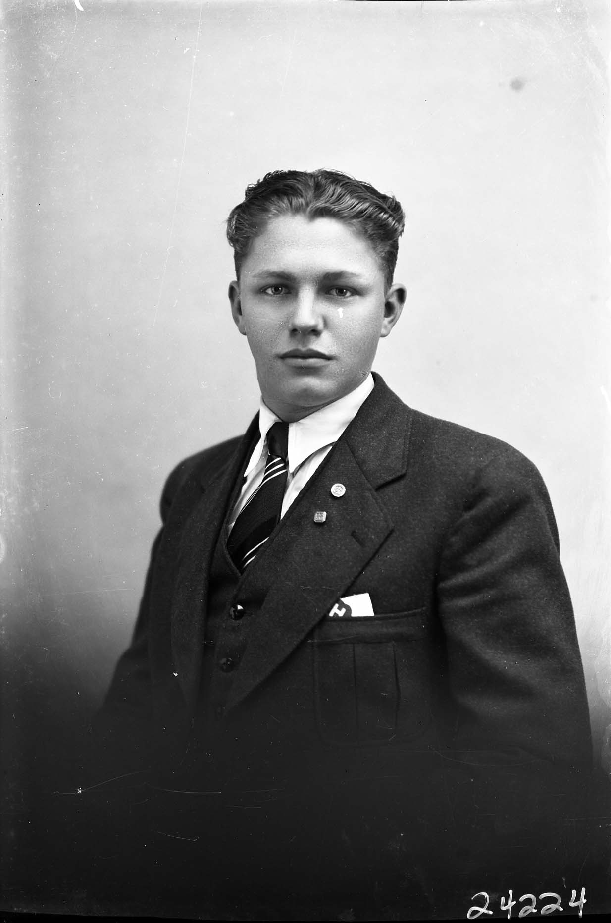 Portrait photograph of an unidentified young man in a suit and striped tie with two pins on his lapel. A handkerchief and something with the letter, "H", on it, are sticking out of his breast pocket.