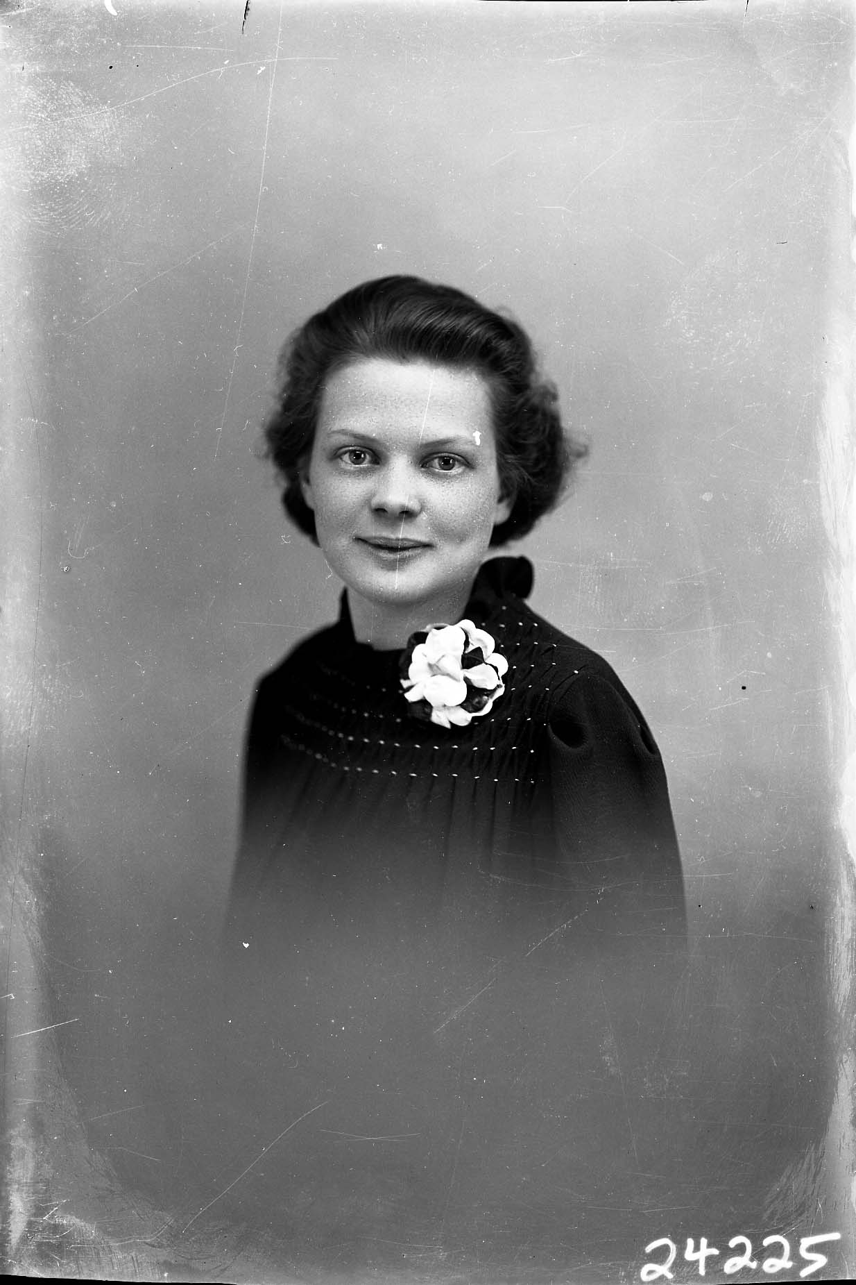 Portrait photograph of an unidentified young woman wearing a corsage on her dress.