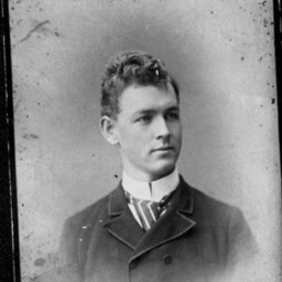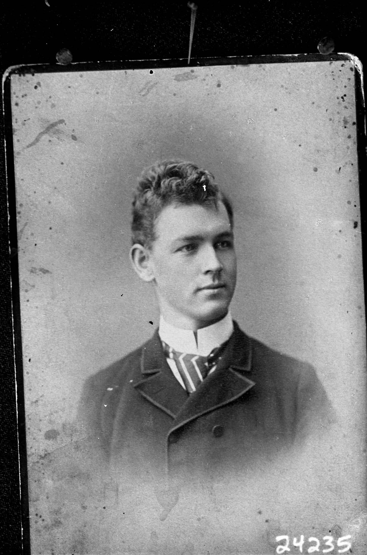 Photo of a postcard photograph of an unidentified young man, shown in portrait, wearing a double-breasted suit jacket with a stiped tie and starched collar.