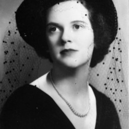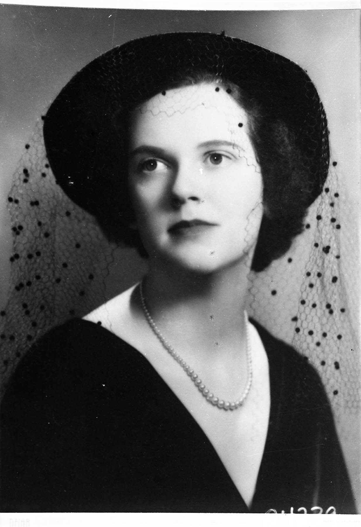 Portrait photograph of an unidentified woman wearing faux pearls and a black hat with netting that hangs down on both sides of her face.