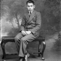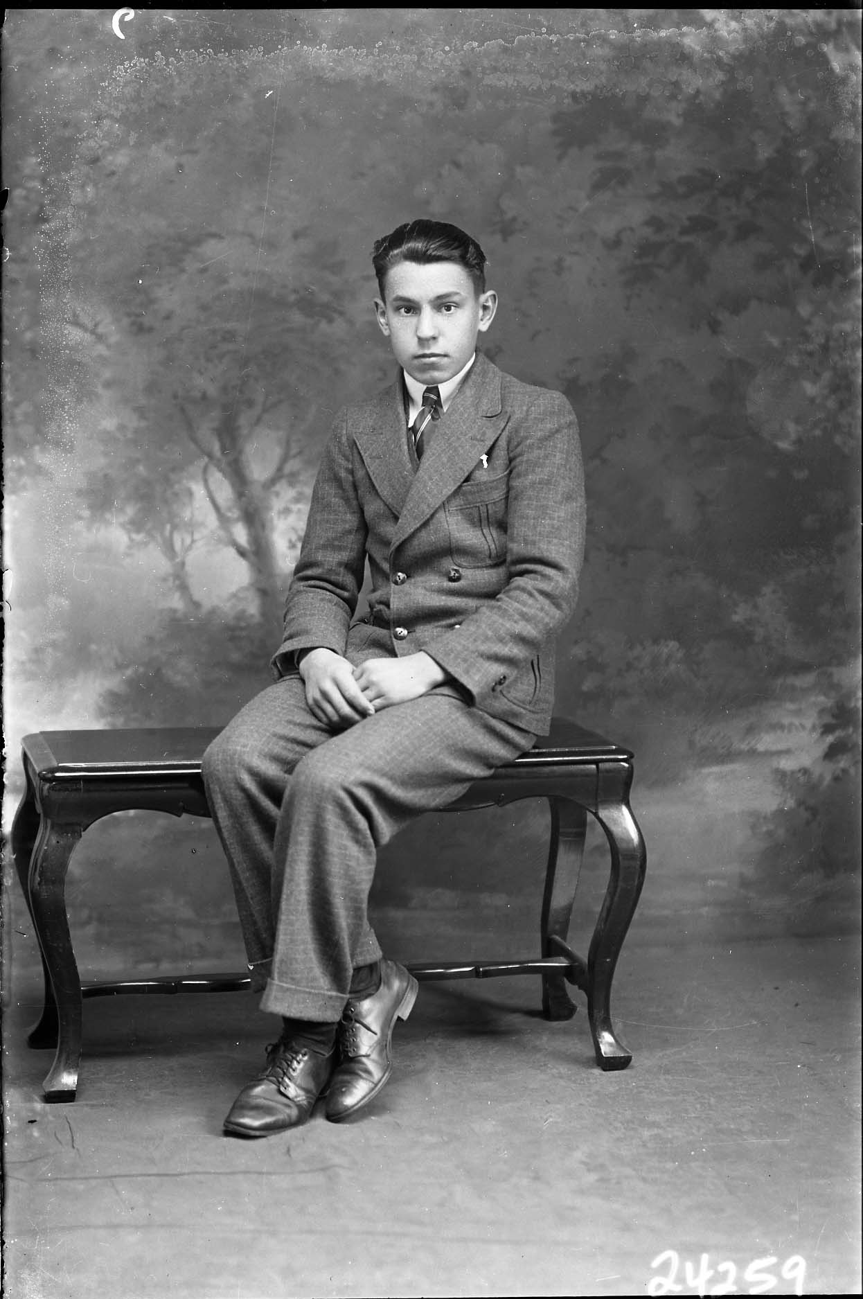Unidentified young man, probably teen-aged, is wearing a suit and tie and is posed seated on a bench with his ankle crossed.