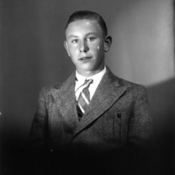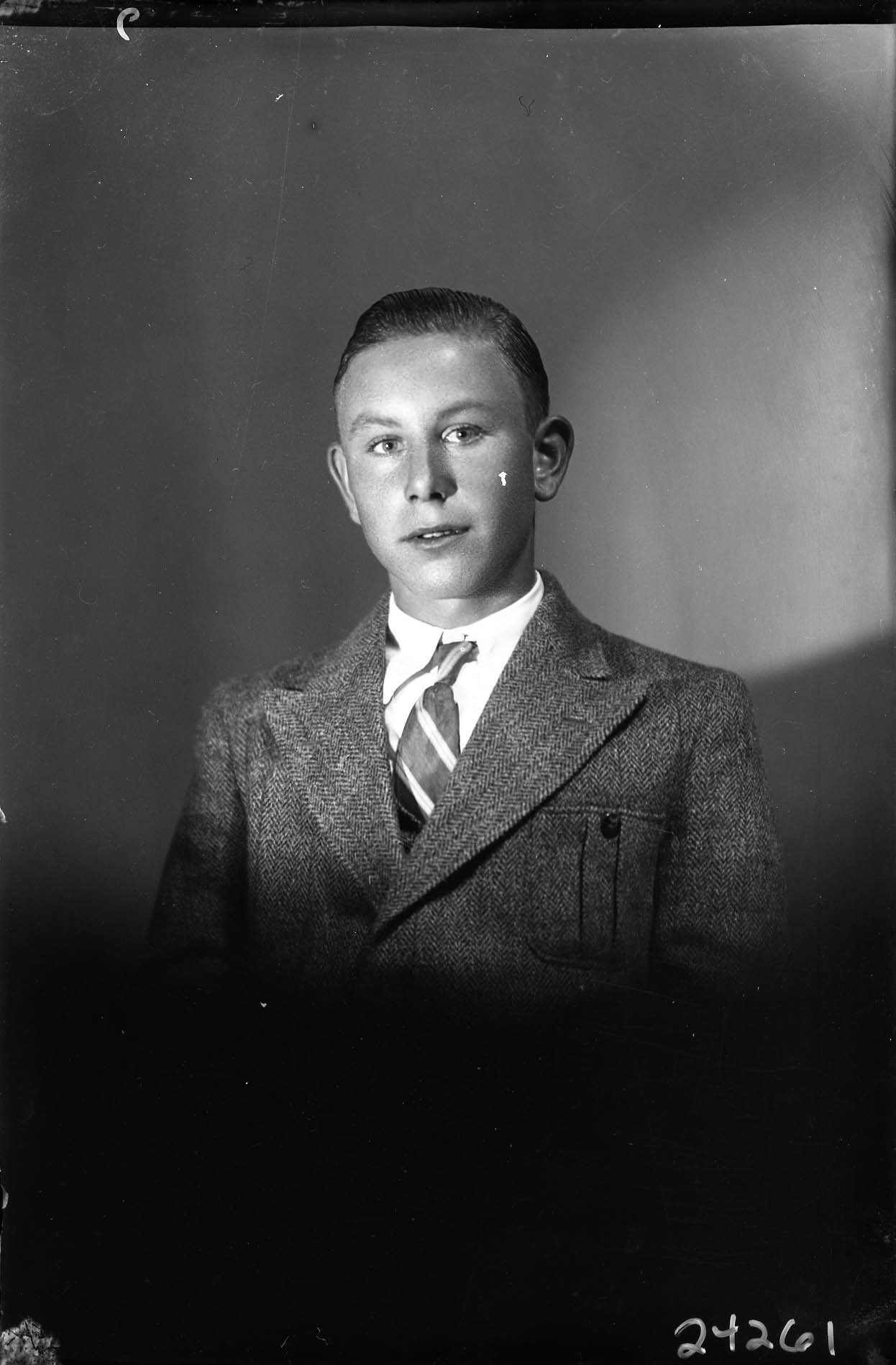 Portrait photograph of an unidentified young man, probably teen-aged, wearing a suit and striped tie.