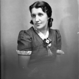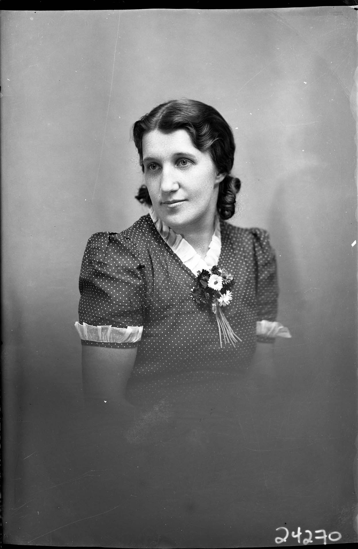 Portrait photograph of an unidentified woman wearing a polka-dotted dress with a flower corsage on the front.