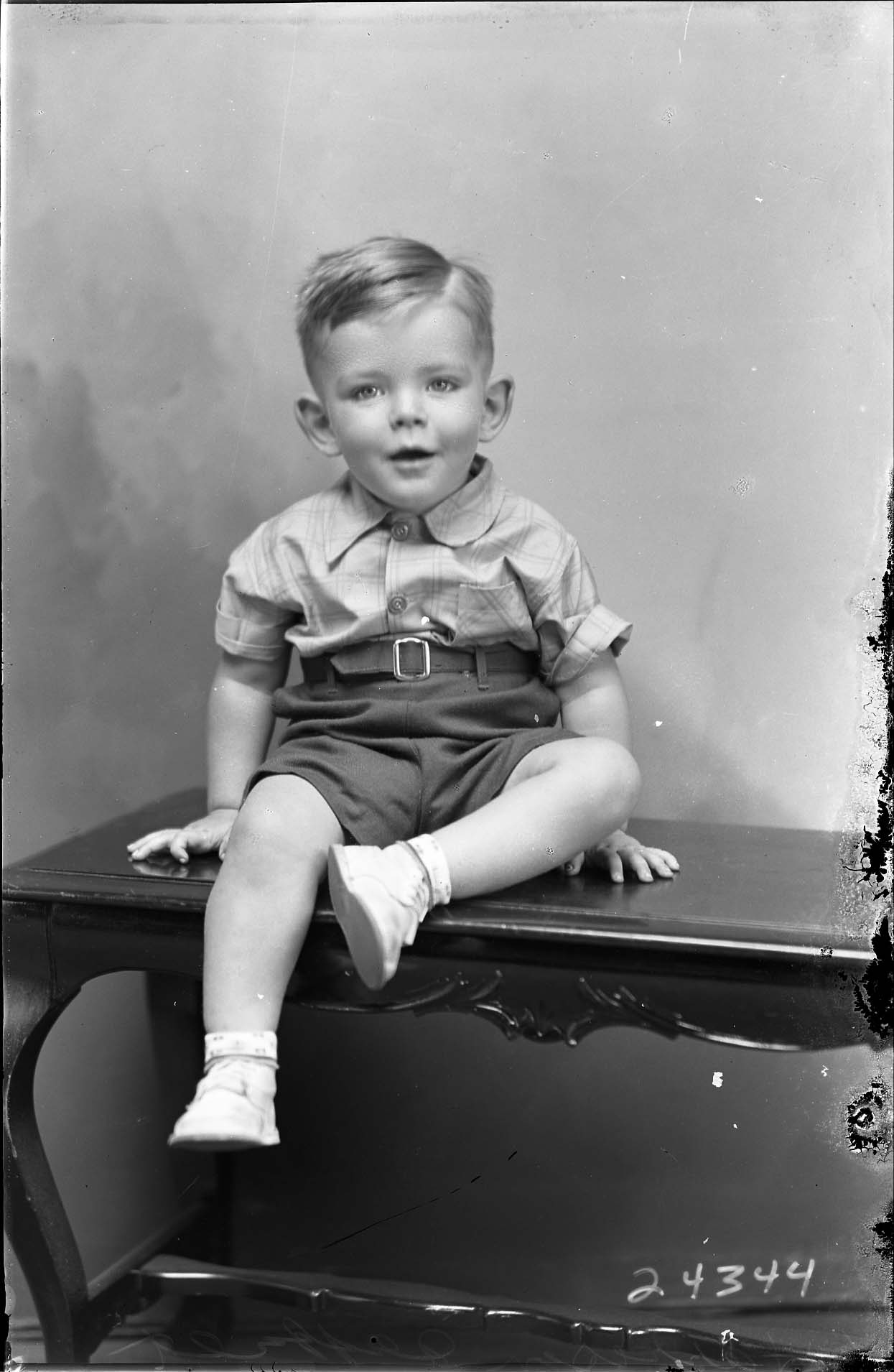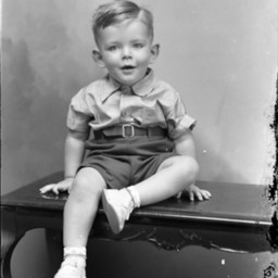Unidentified young boy is seated on a bench with one knee bent.