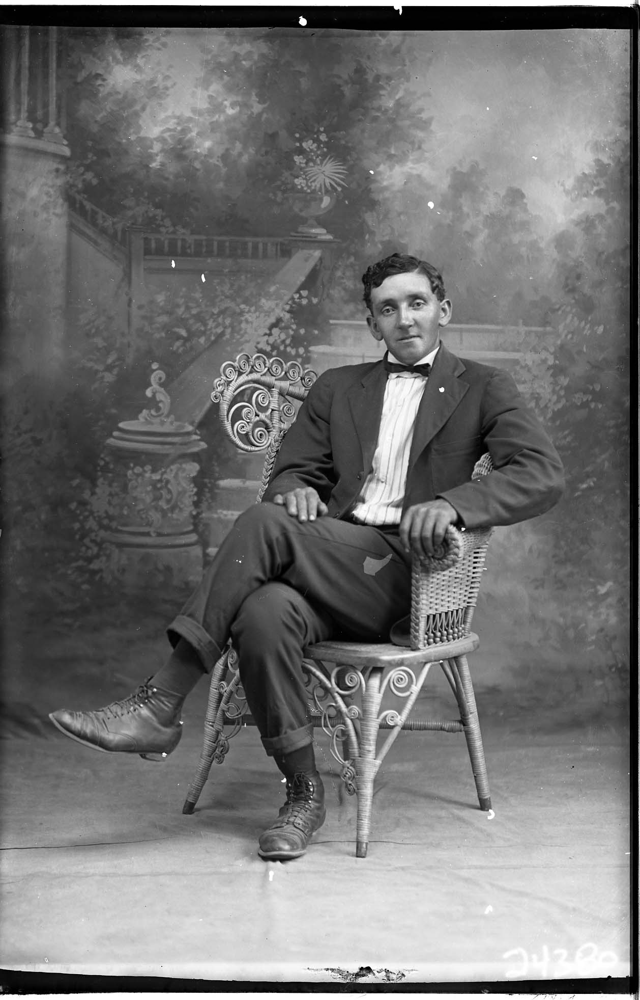Photo of a photograph of an unidentified man wearing a bow tie and striped shirt. He is seated on a wicker chair.