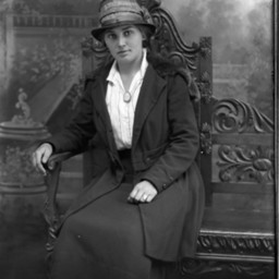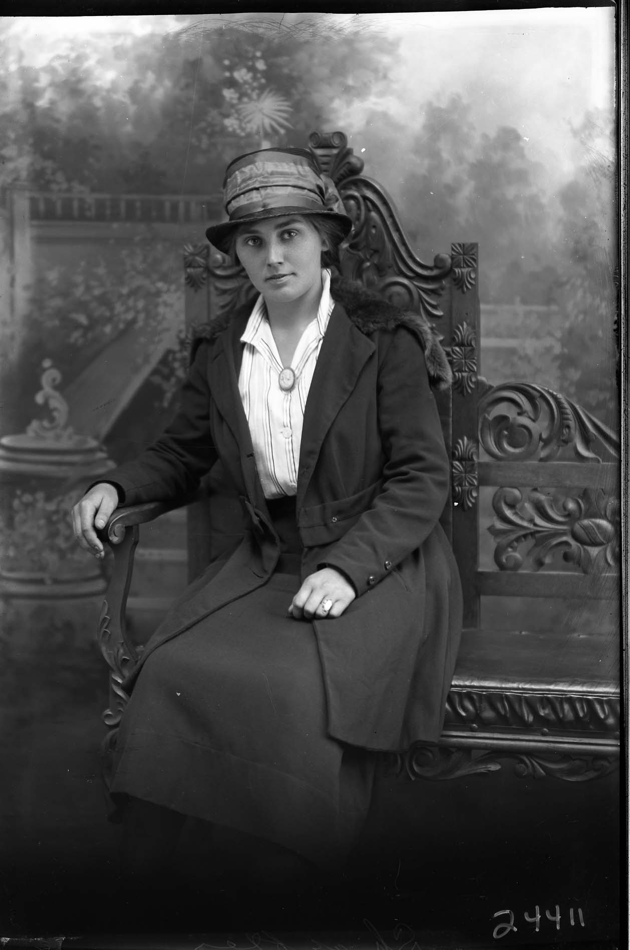Unidentified woman in a hat and wearing a cameo pin on her blouse, is seated in a chair.