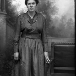 Unidentified woman in a long-sleeved dress is standing by a bench.