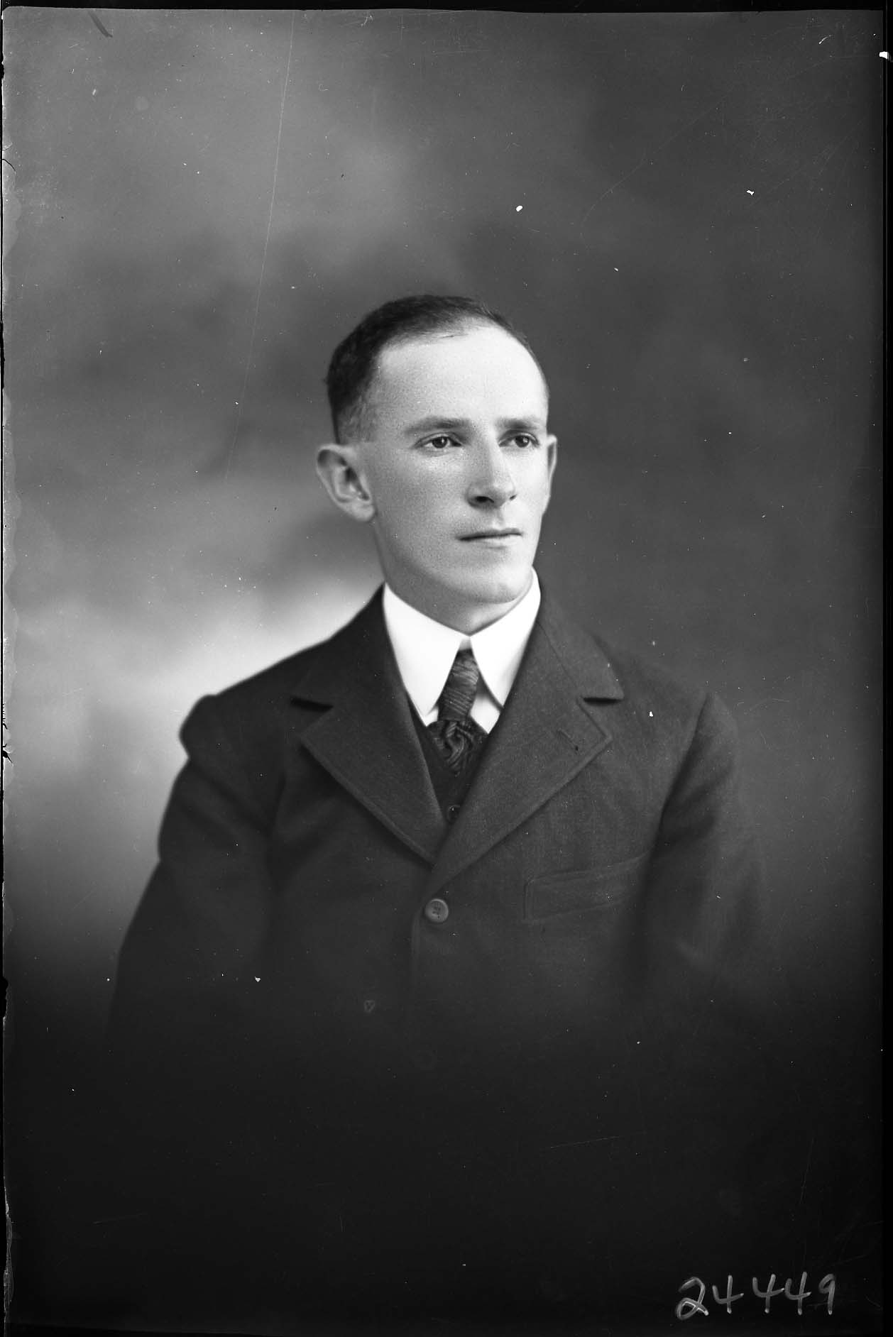 Portrait photograph of an unidentified man wearing a suit and tie with a starched collar.