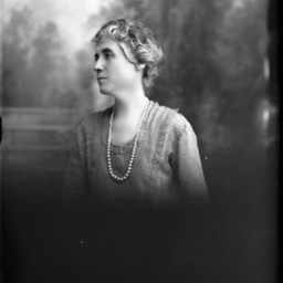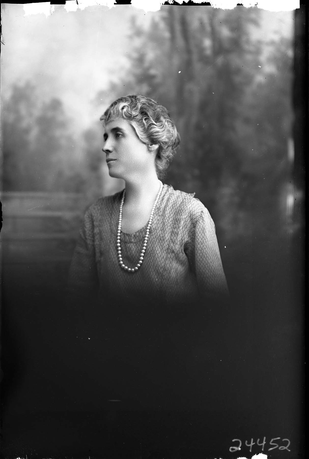 Portrait photograph of an unidentified woman with her hair pulled back and style, is wearing a long necklace. She is posed looking to the side, almost in profile.