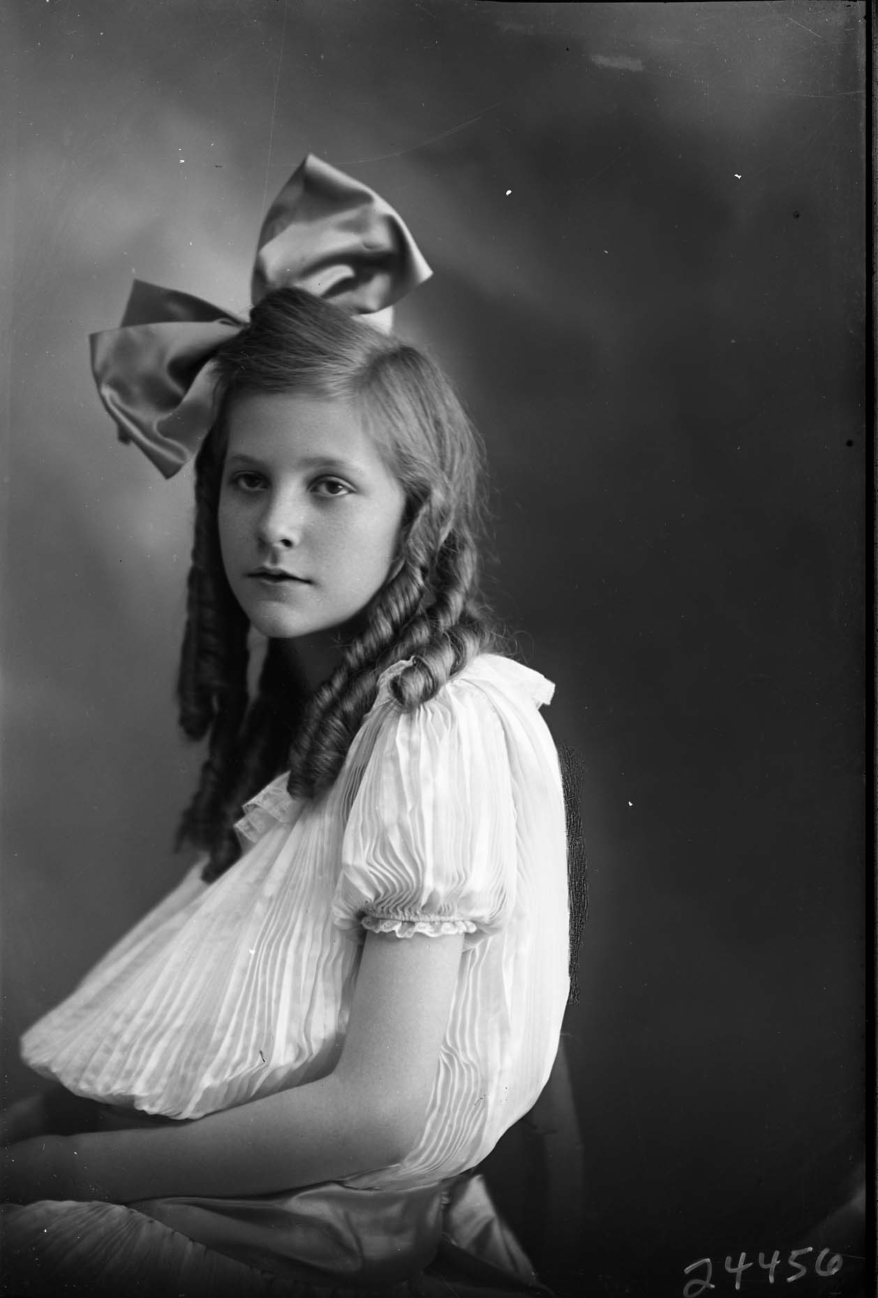 Portrait photograph of an unidentified girl, possibly teen-aged, wearing a bow in her long, curled hair. She is photographed from the side and looking towards the camera.