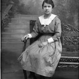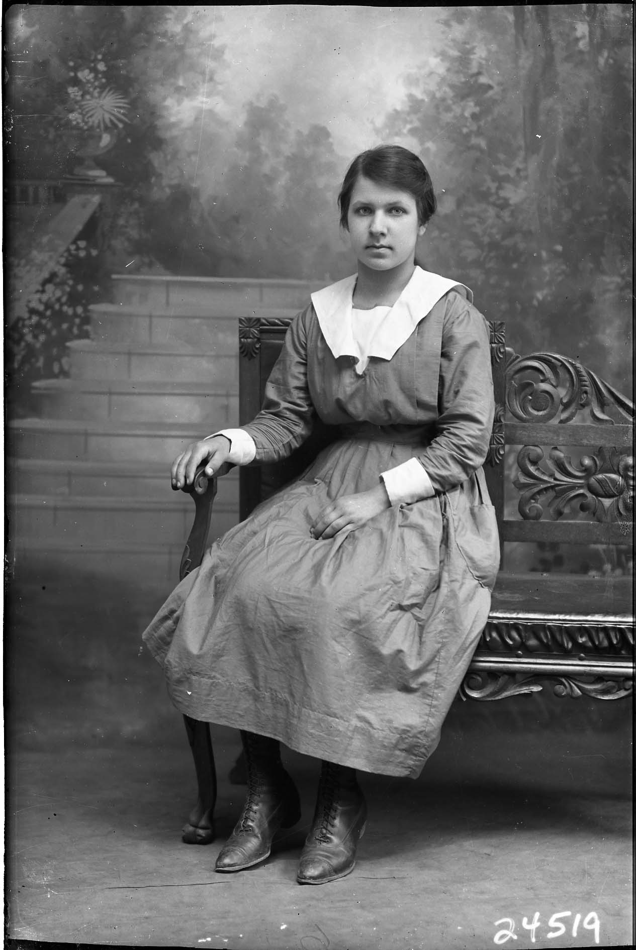 Unidentified woman seated on a bench with her hair pulled back and wearing a dress with white cuffs and collar.