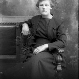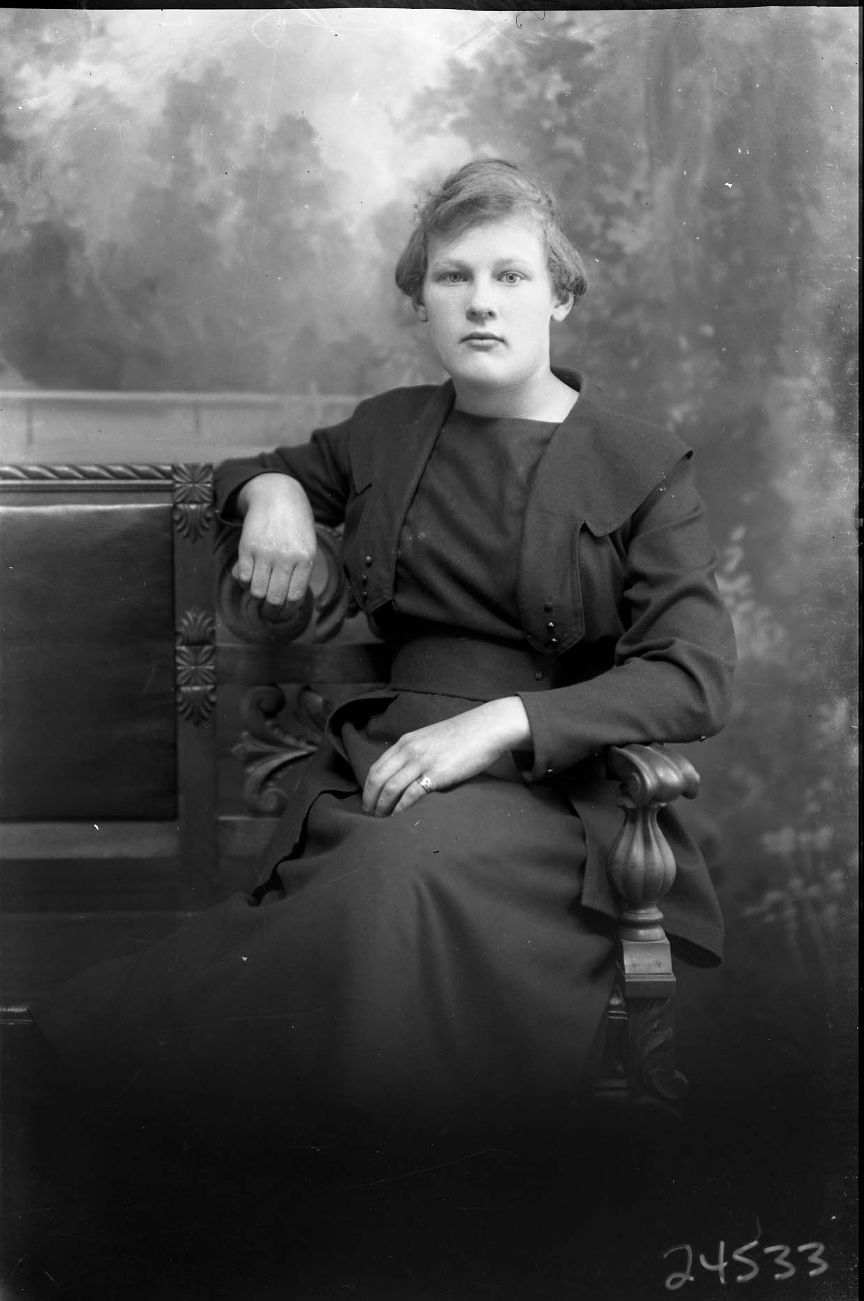 Unidentified young woman is seated on a bench with one arm on the arm and the other resting on the back of it.