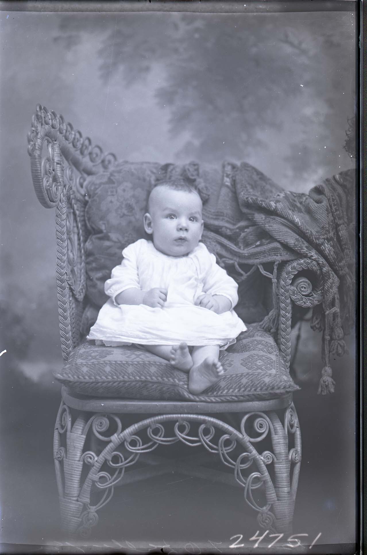 Unidentified barefoot baby is propped on a pillow on a wicker chair.