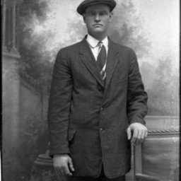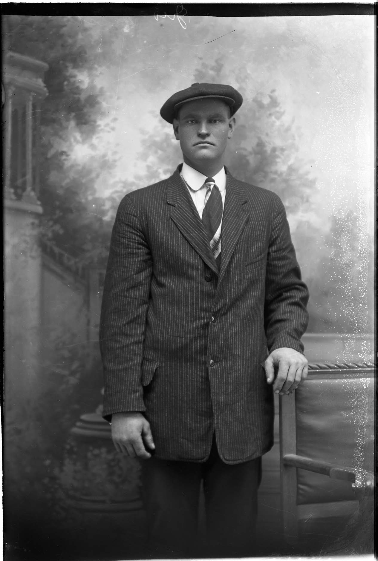 Unidentified man standing by a bench and wearing a suit and tie with a cap.