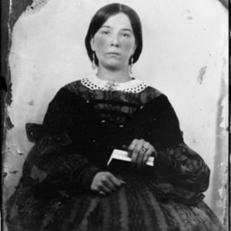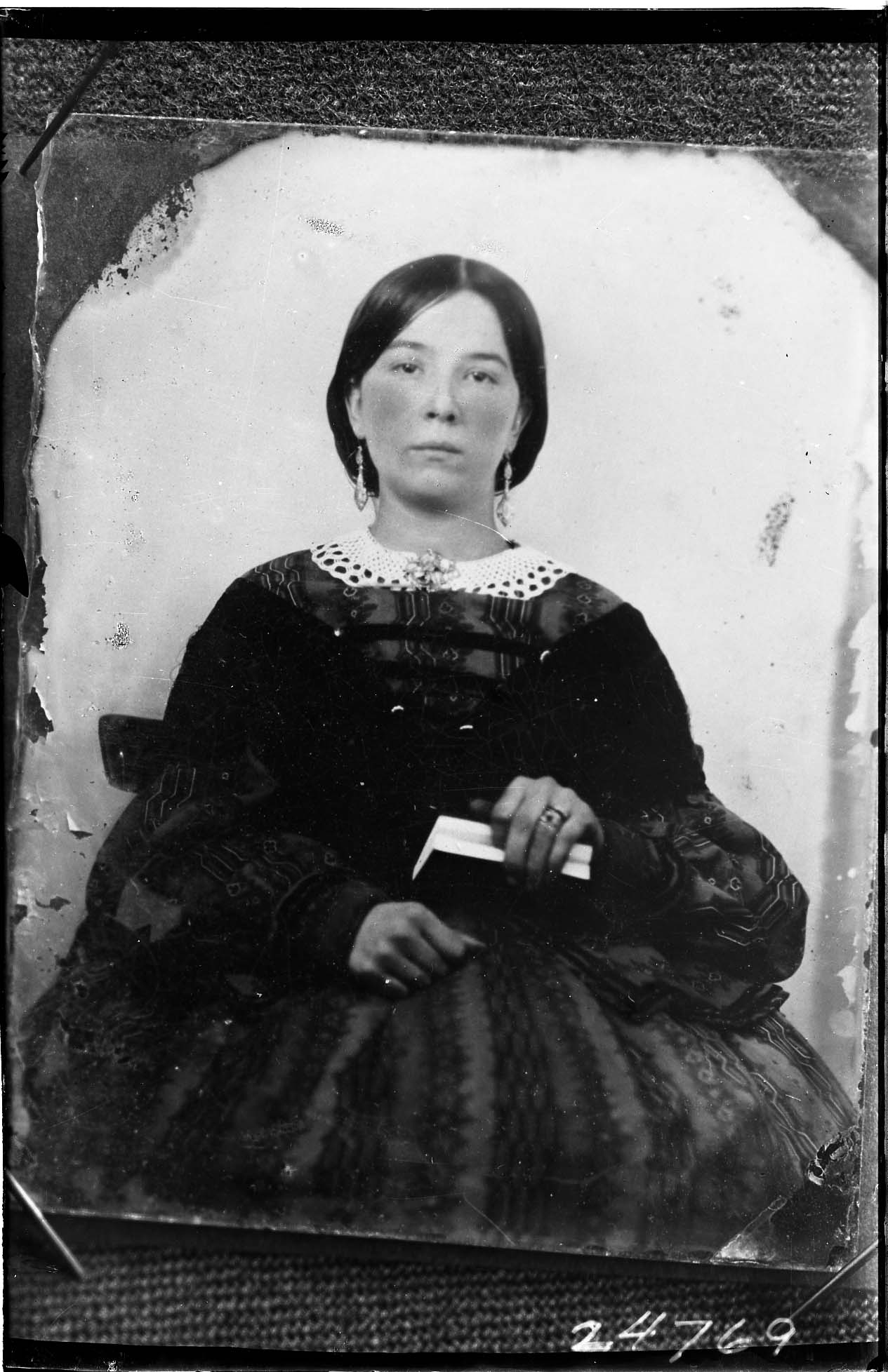 Photo of an older photograph of an unidentified woman wearing earrings, 19th century clothing, and holding a book.