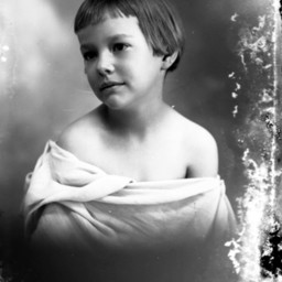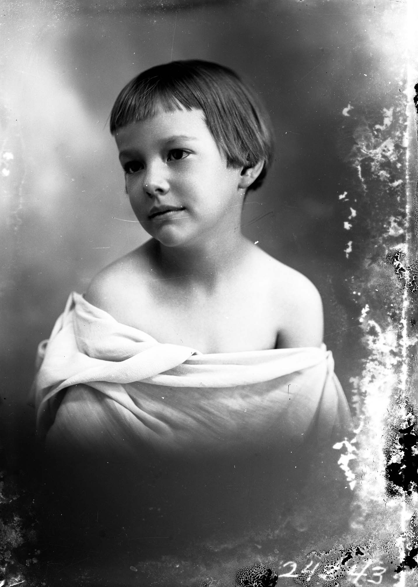 Portrait photograph of an unidentified young child with short hair and bangs with bare shoulders.