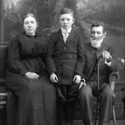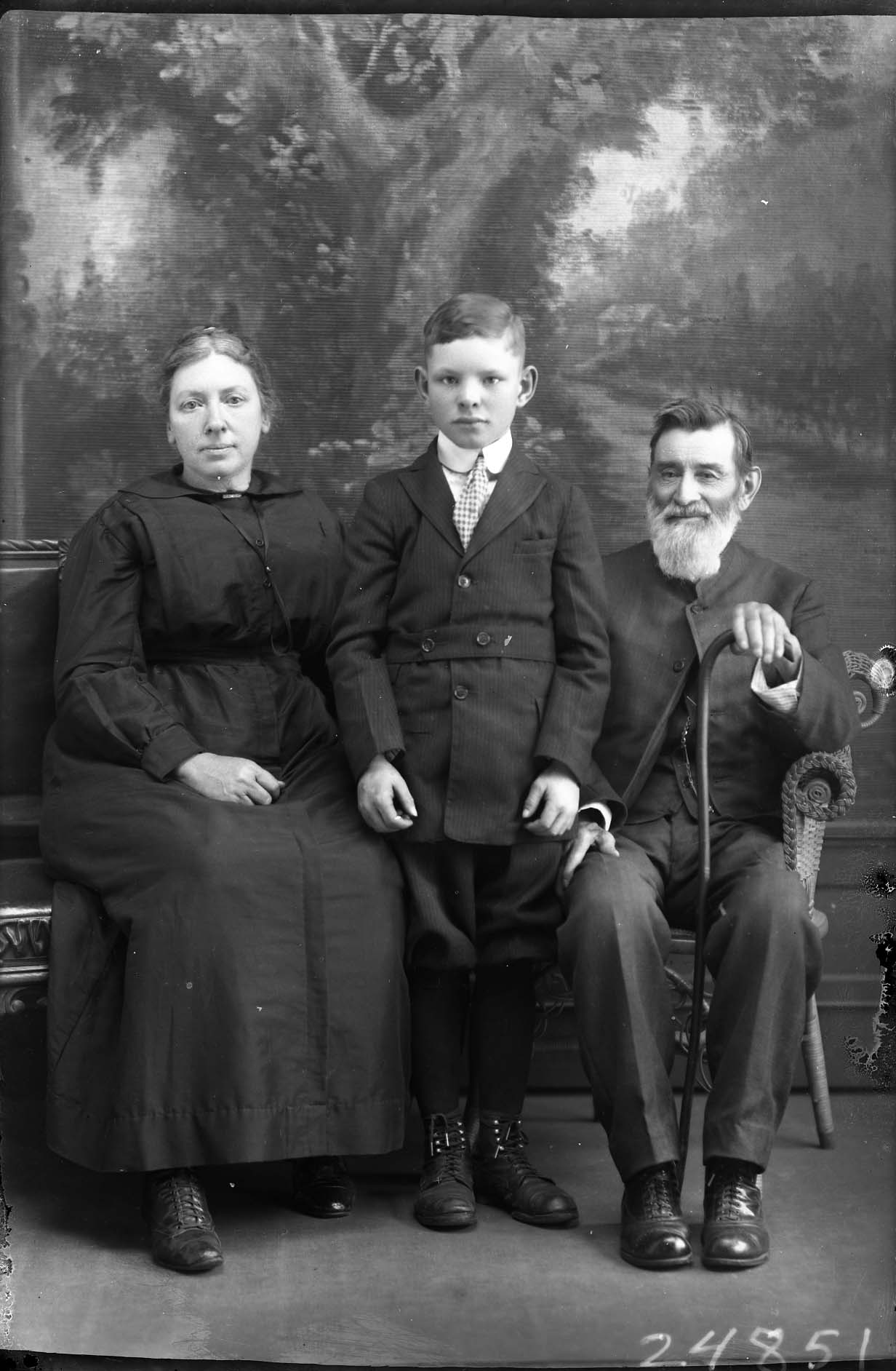 Unidentified man with a beard and cane is seated on the right with an unidentified woman and boy beside him.