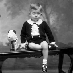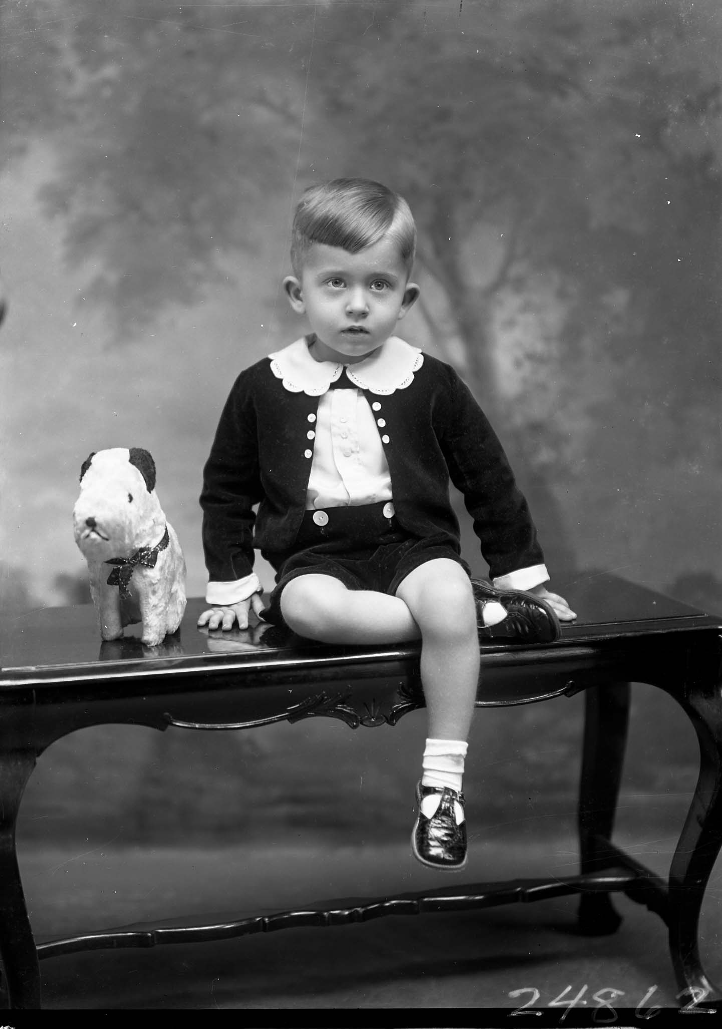 Unidentified boy is seated on a bench beside a stuffed dog. He has one leg under the other and is wearing a shirt with a scalloped collar.