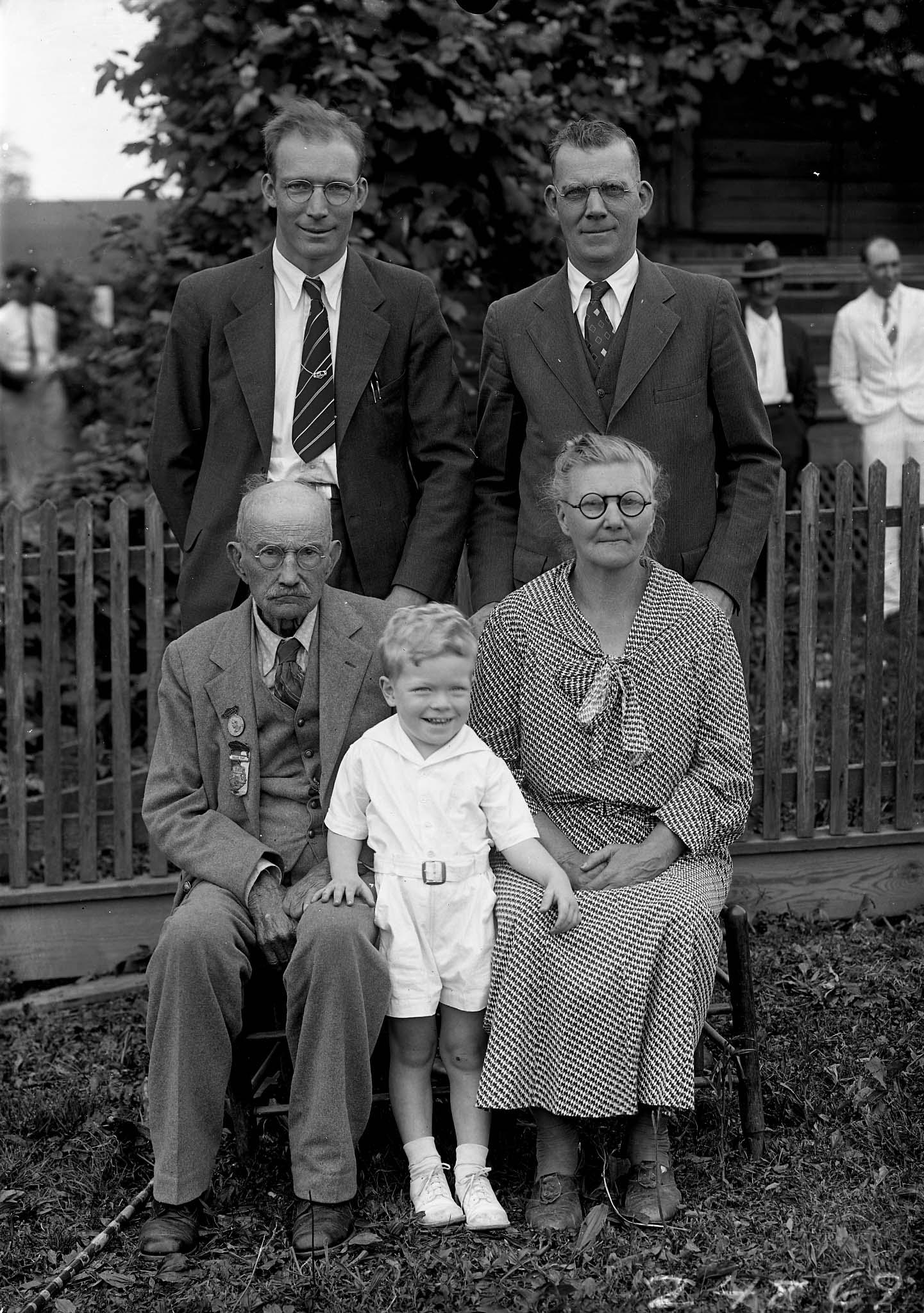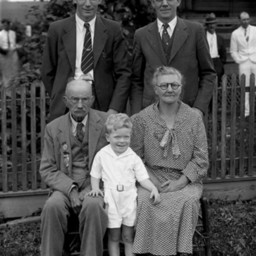 Five unidentified people are posed together outdoors. An older man and woman are seated together with a child standing between them.