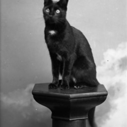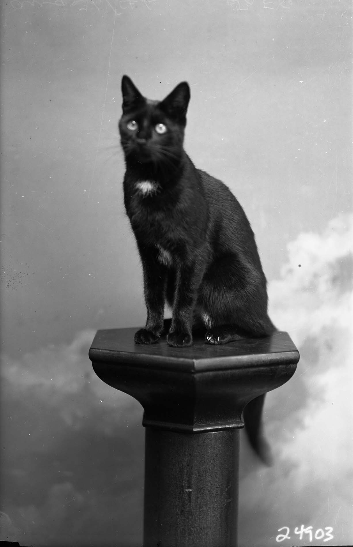 Unidentified mostly black, cat is posed on a studio column.