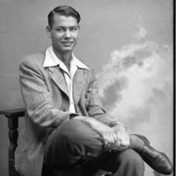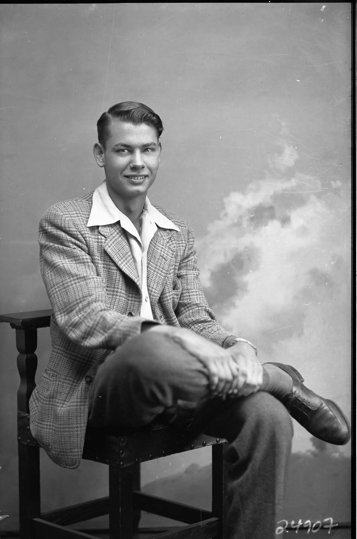 Unidentified young man in a plaid jacket and unbuttoned shirt collar, is seated on a chair with one leg crossed in front of him.