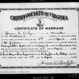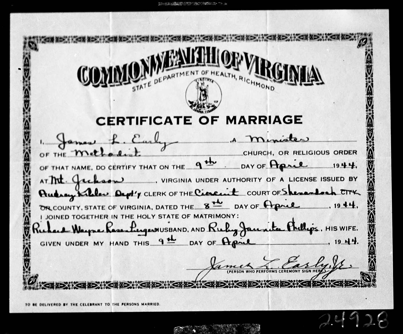 Photograph of the marriage certificate issued by the Commonwealth of Virginia for the marriage between Richard Wayne Rosenberger and Ruby Juanita Phillips.