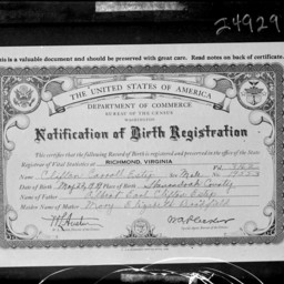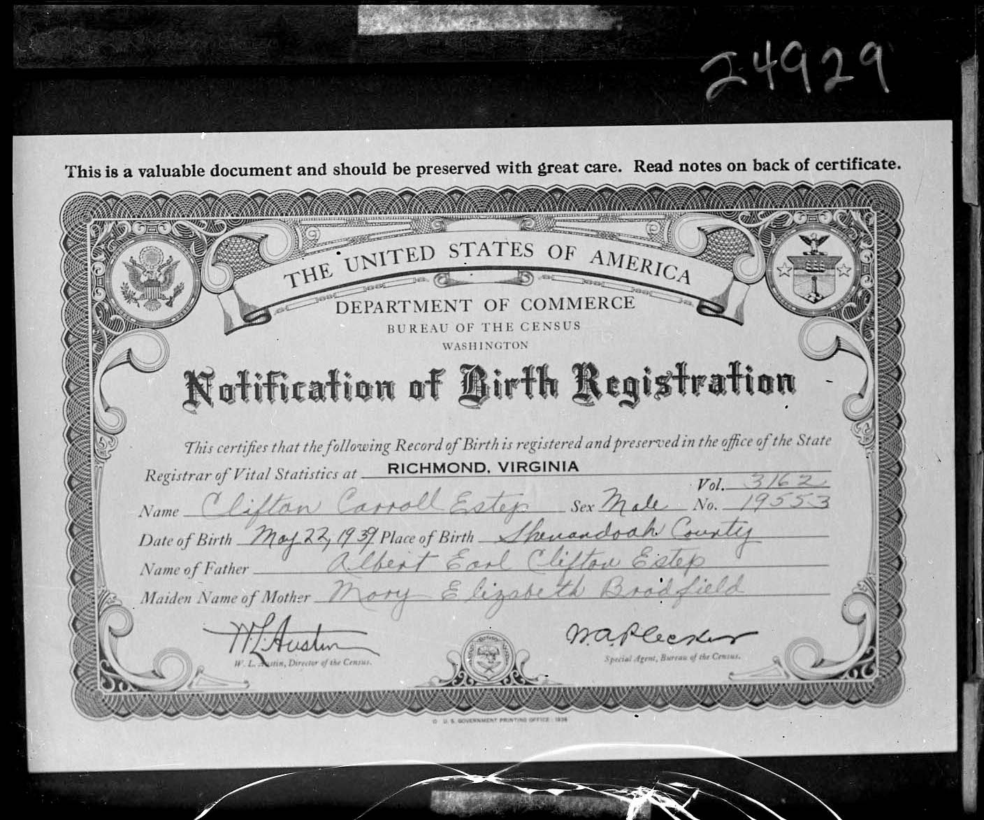 Photograph of the birth registration for Clifton Carroll Estep, born May 22, 1939 in Shenandoah County.