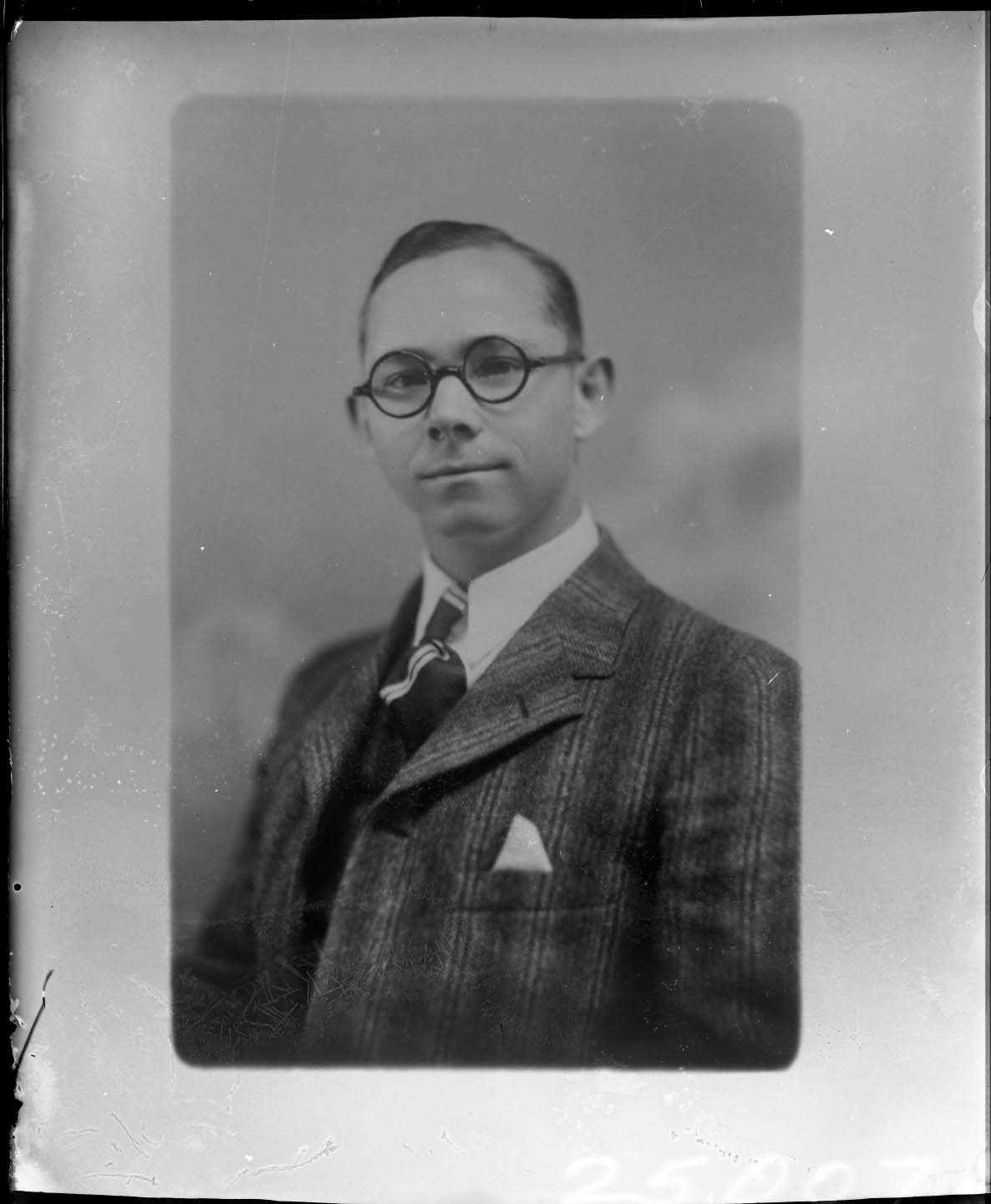 Photo of a photograph of an unidentified man with round glasses wearing a striped suit and tie with a handkerchief visible sticking out of his breast pocket.