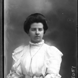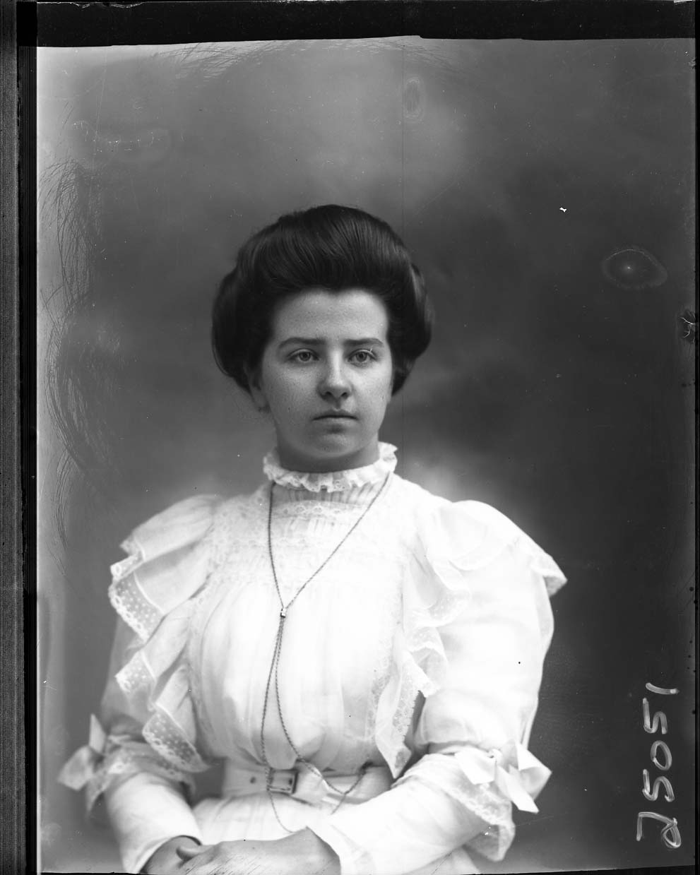 Portrait photograph of an unidentified woman with her hair styled up and wearing a necklace with her long-sleeved dress.