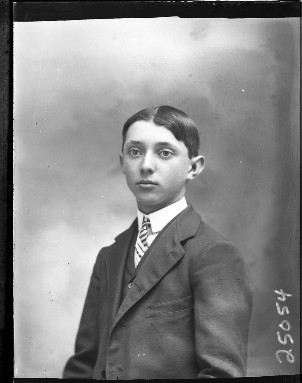 Portrait photograph of an unidentified young man, probably teen-aged, wearing a suit and tie.