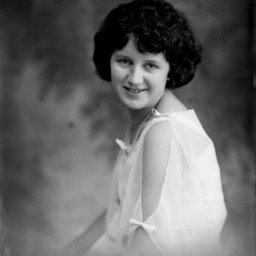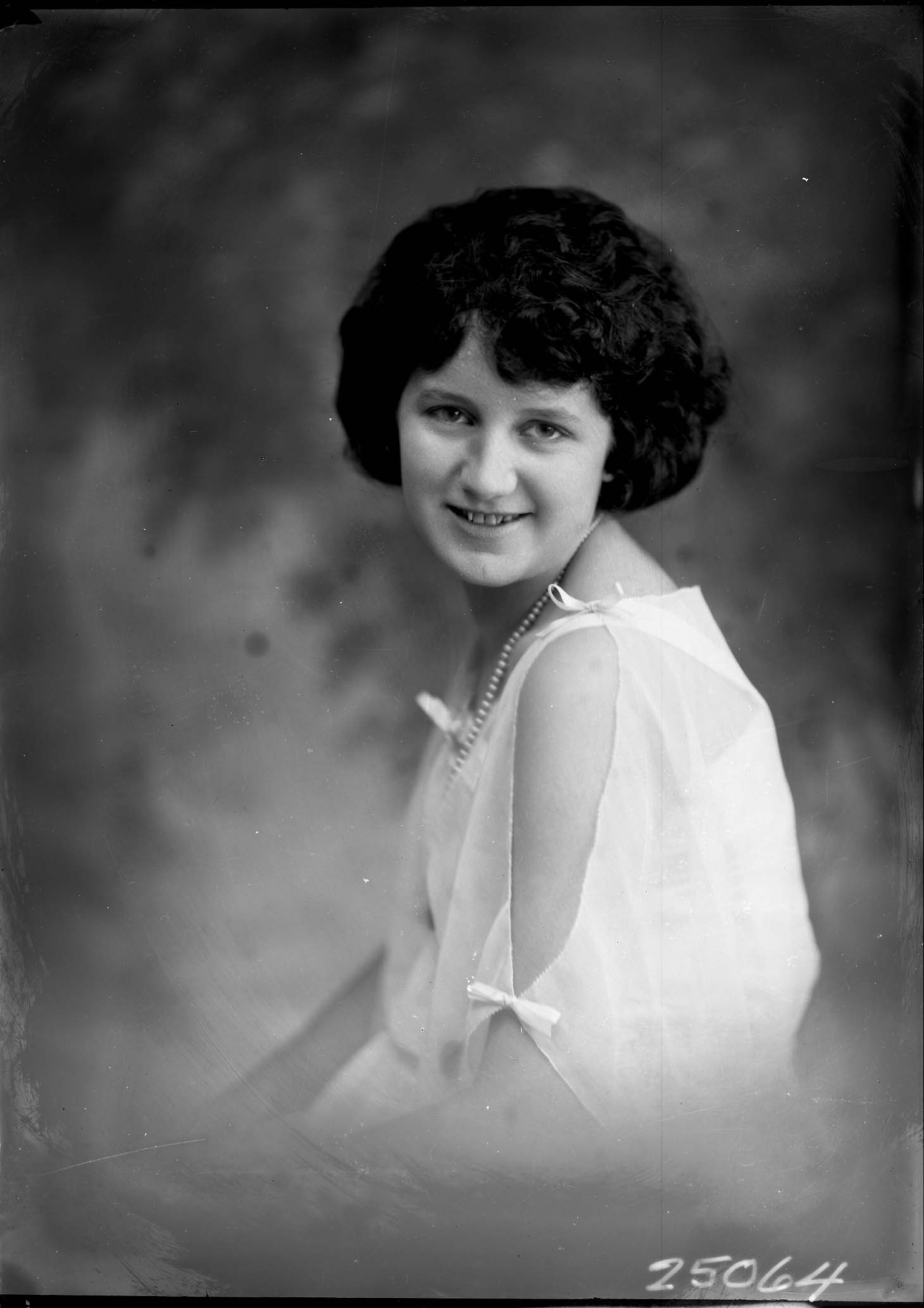 Portrait photograph of an unidentified young woman with short curled hair and wearing faux pearls with her dress.