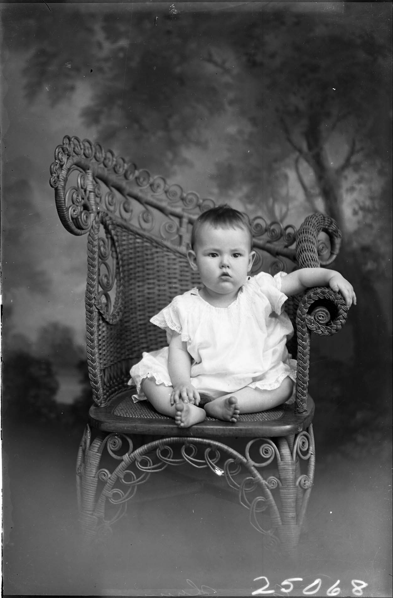 Unidentified barefoot young child is seated on a wicker chair.