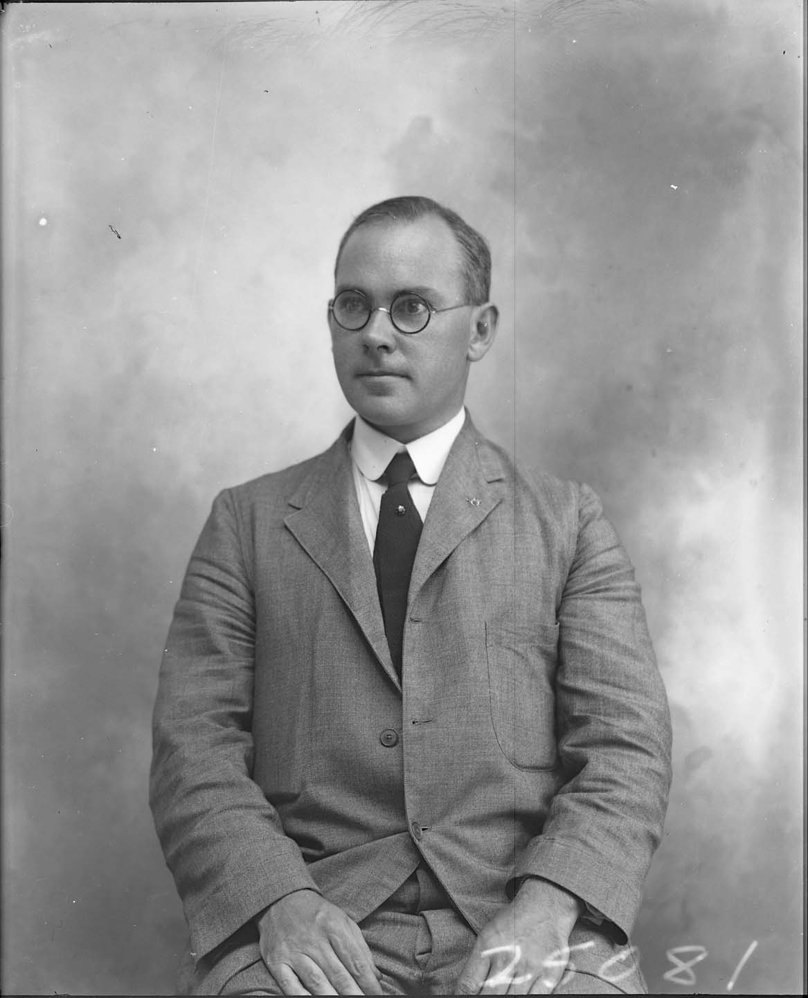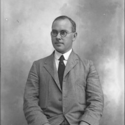 Portrait photograph of an unidentified man with round glasses and wearing a suit and tie.